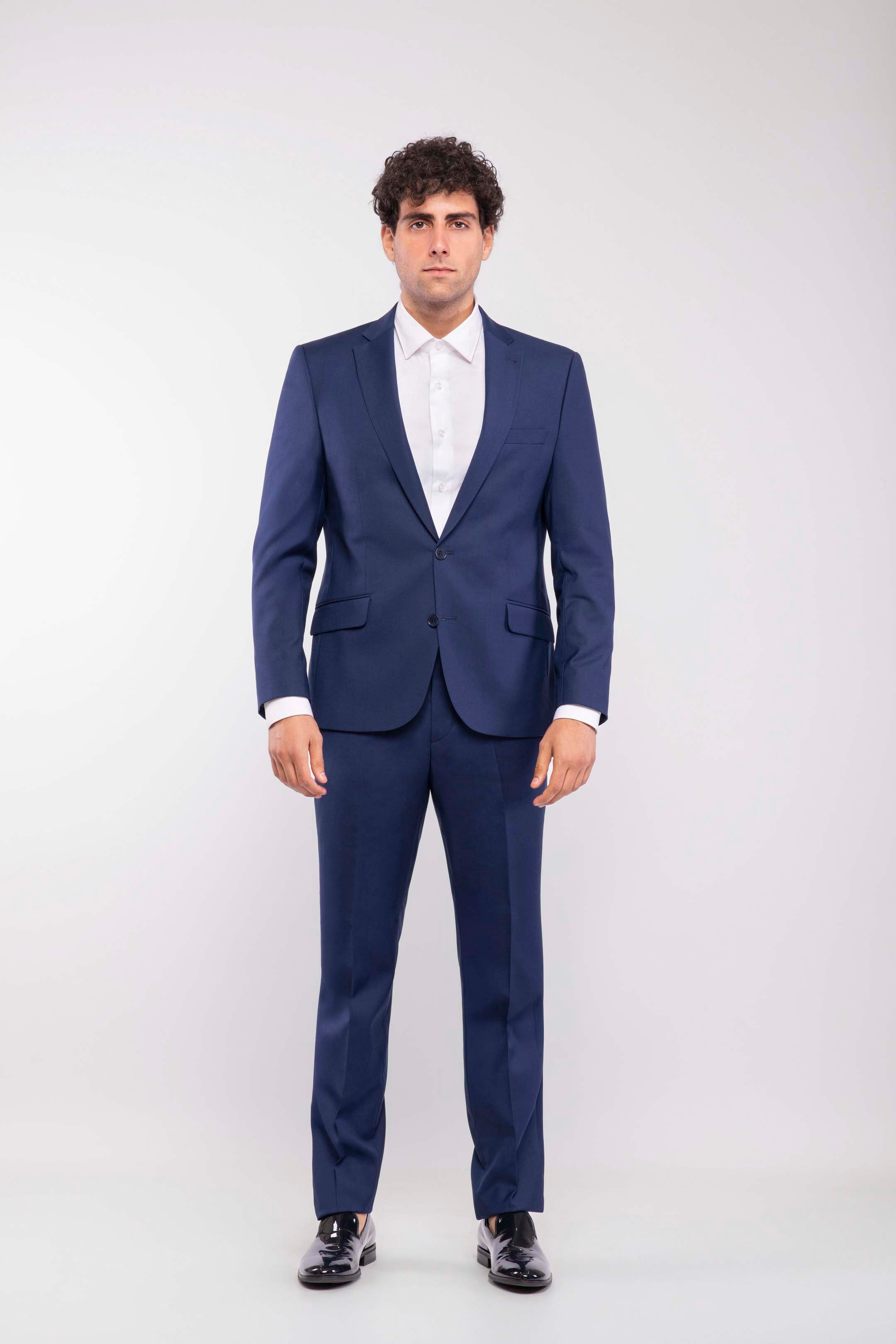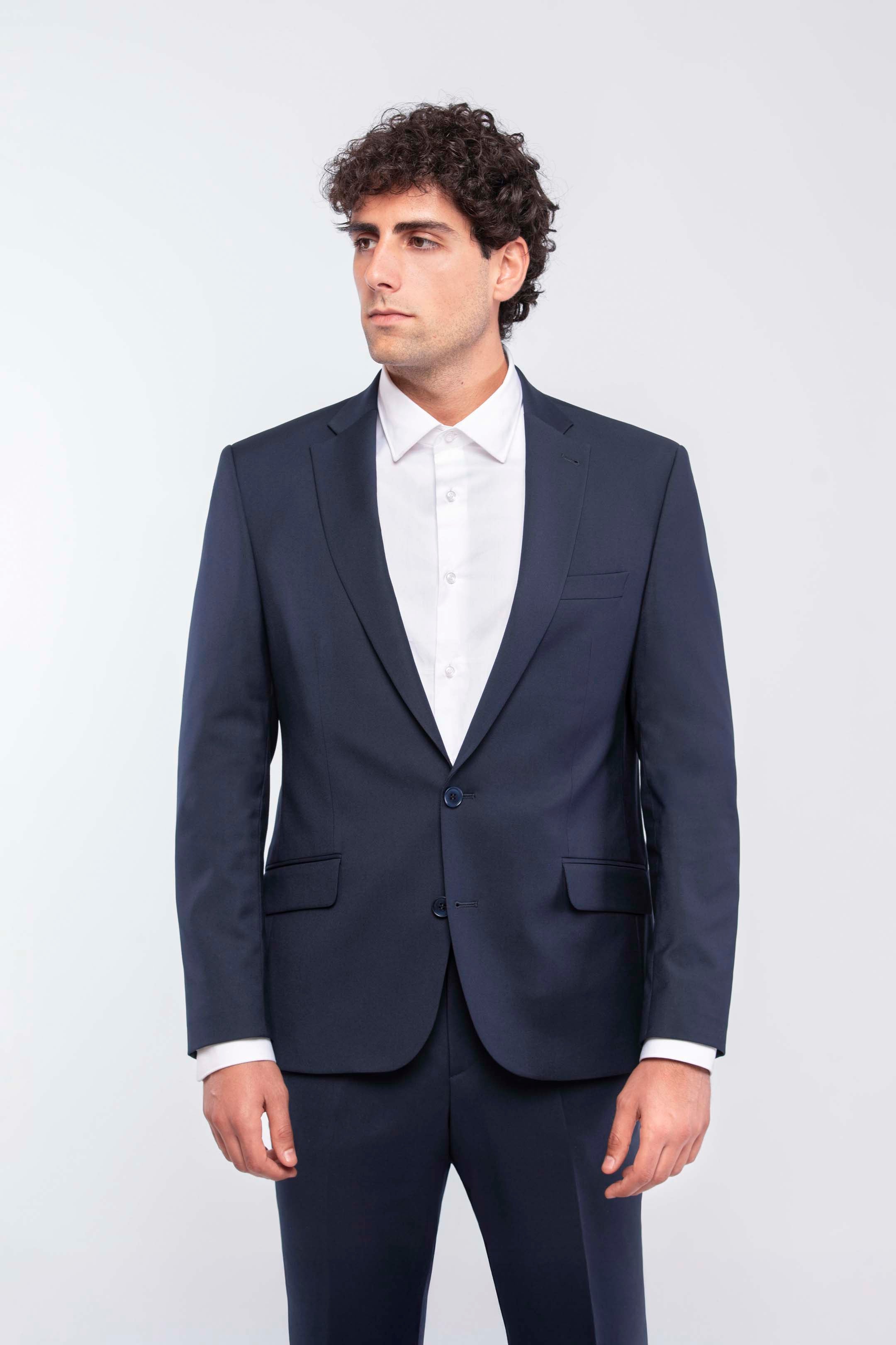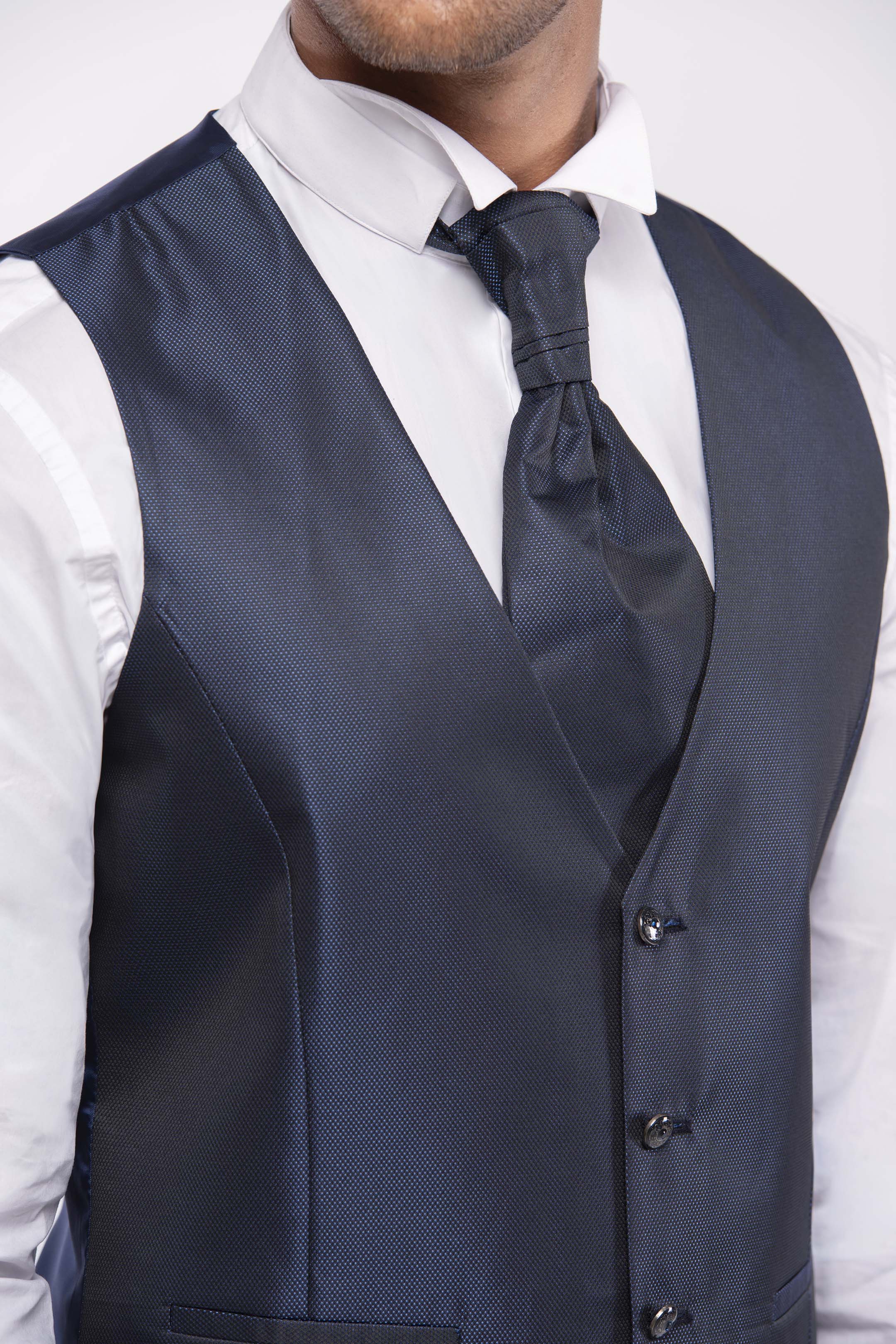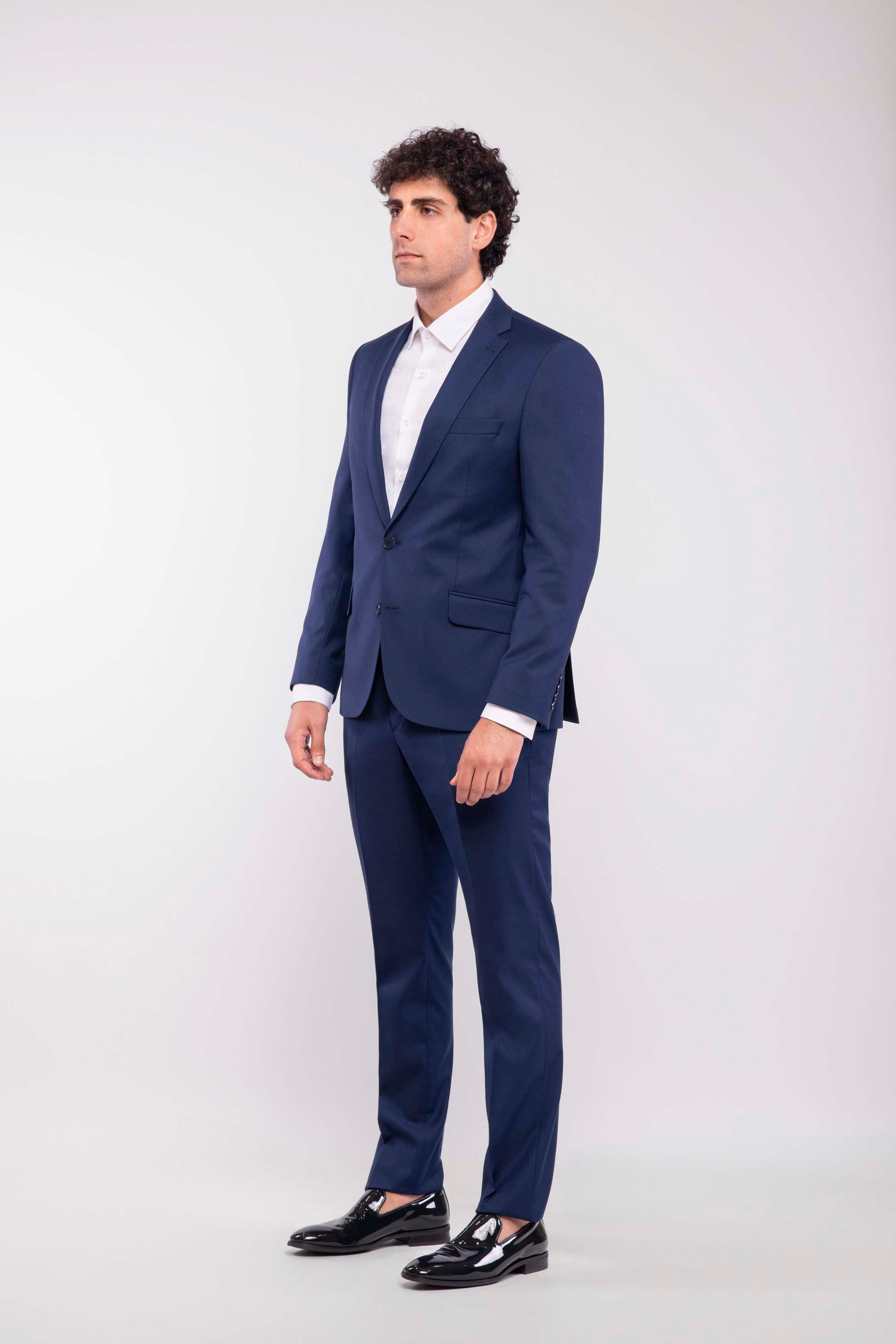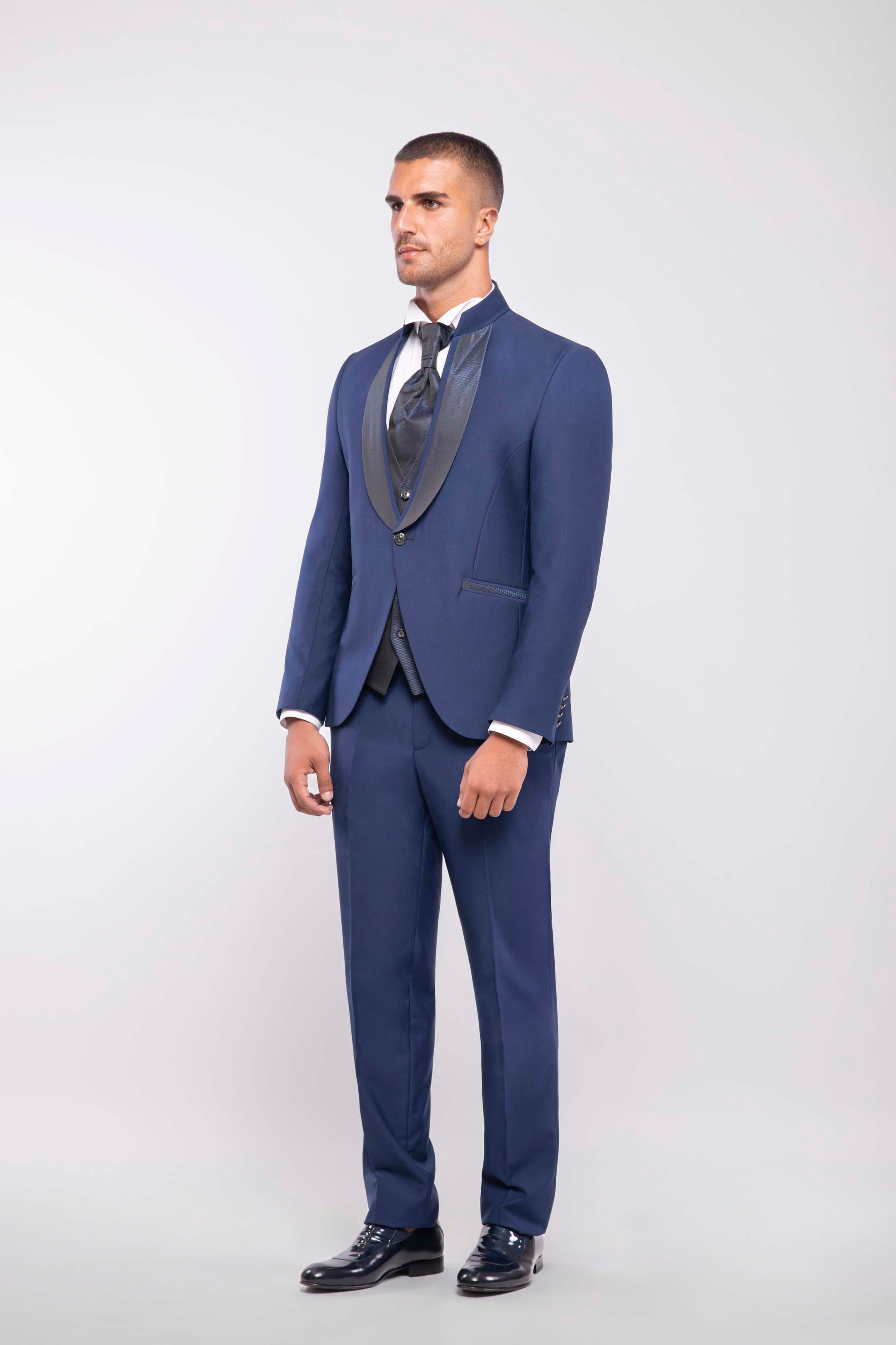 Traje de novio azul "Shard" con cuello mandarín y botones joya en el cuello.