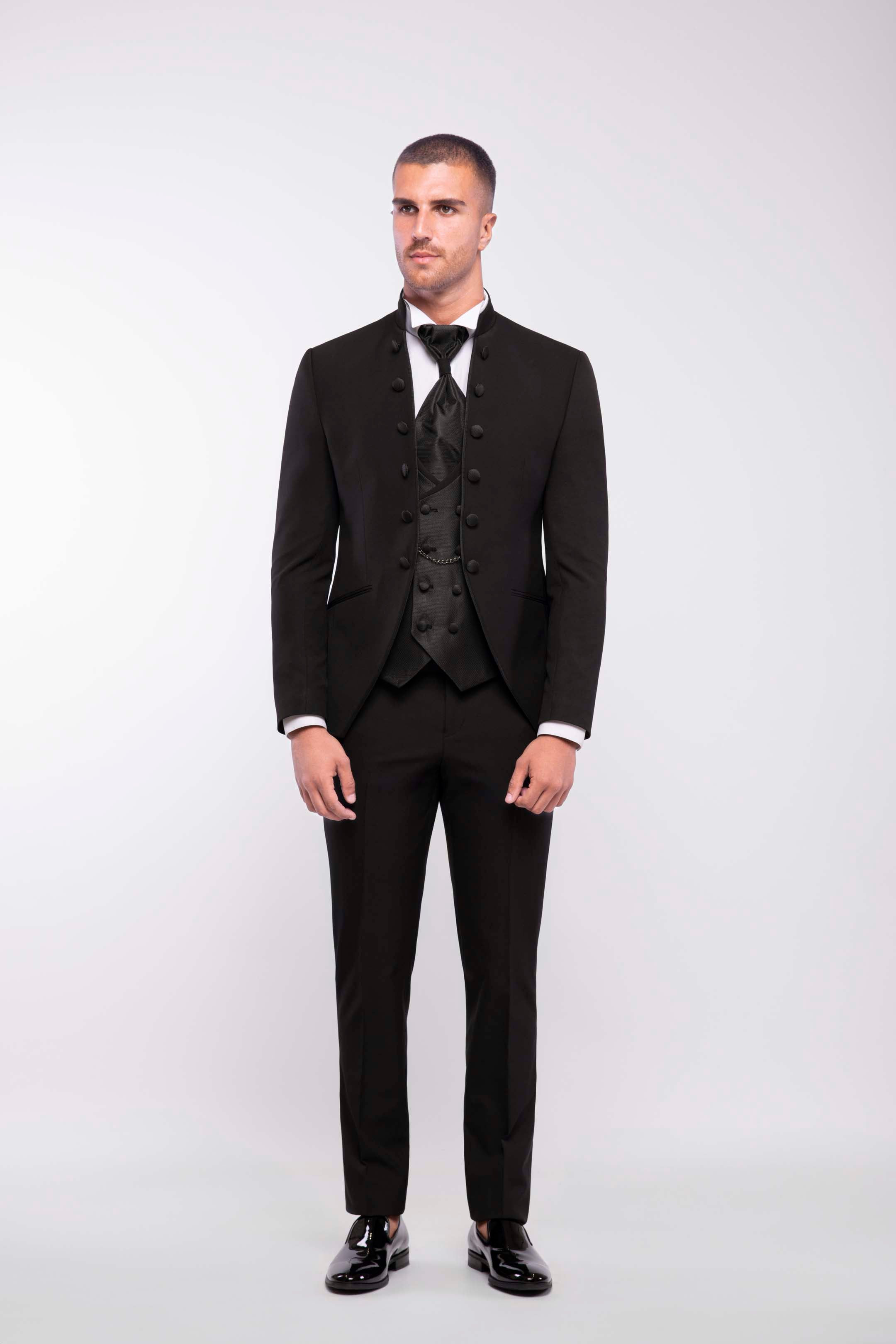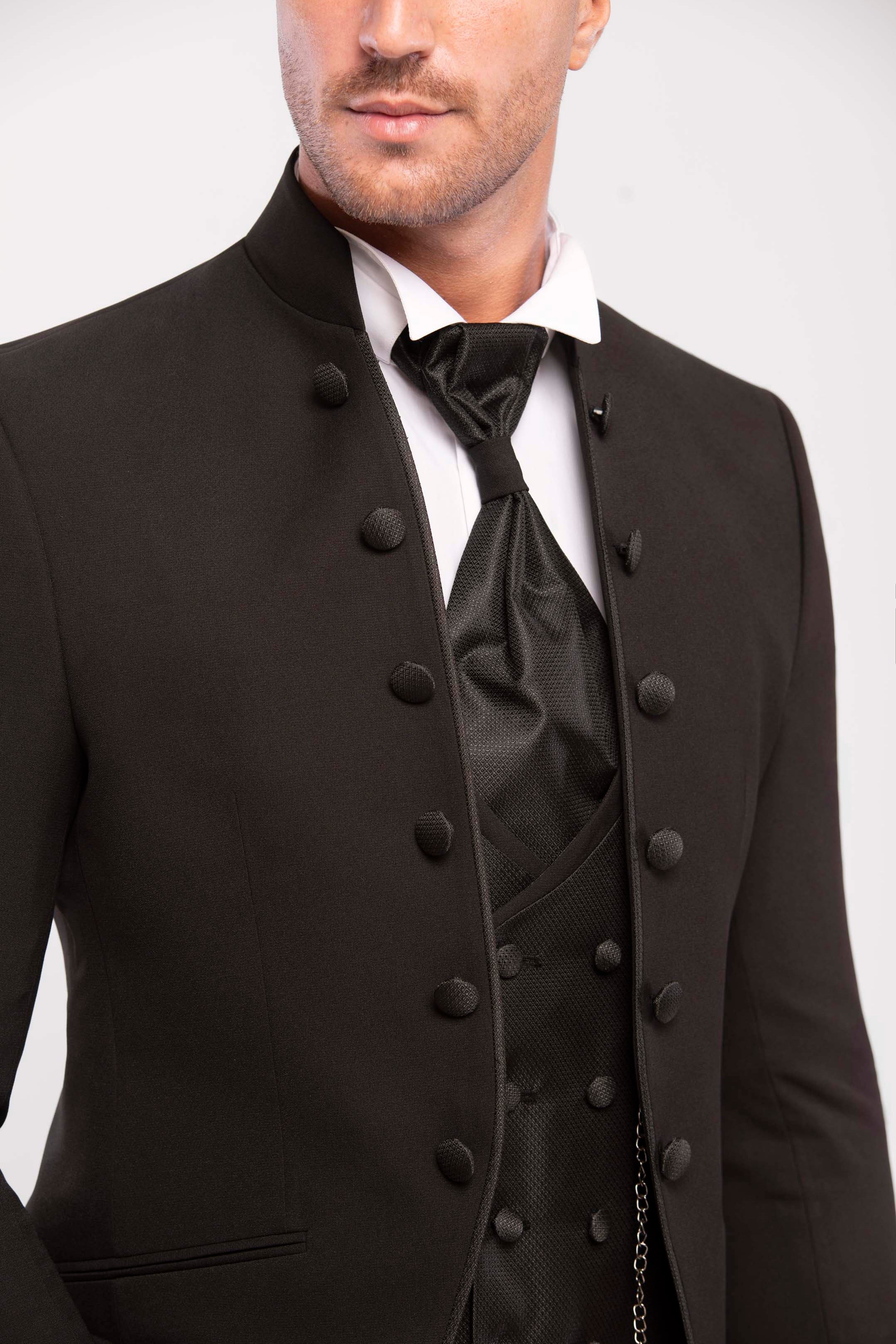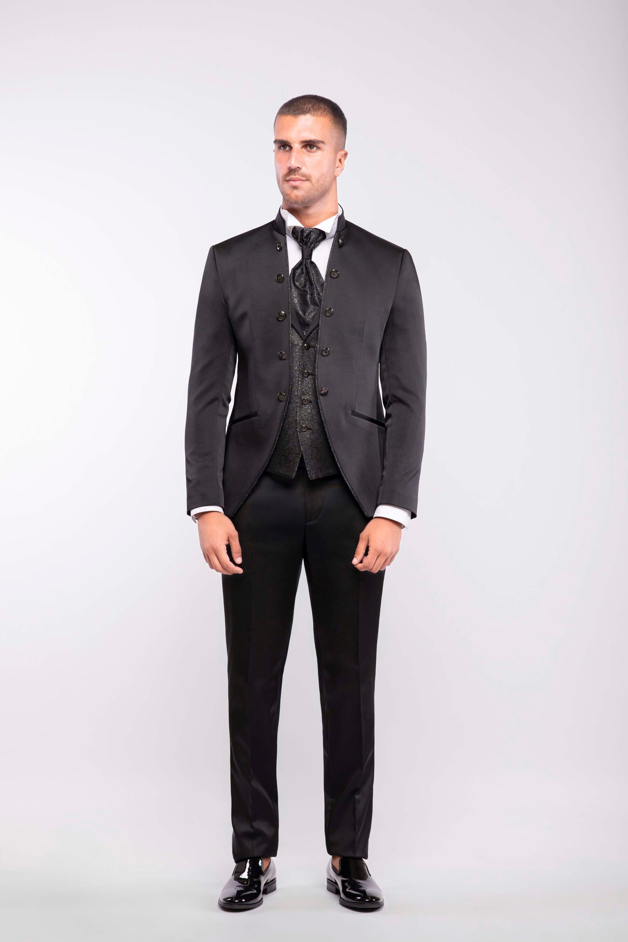 Traje de novio negro "Shard" con cuello mao y botones joya en el cuello.