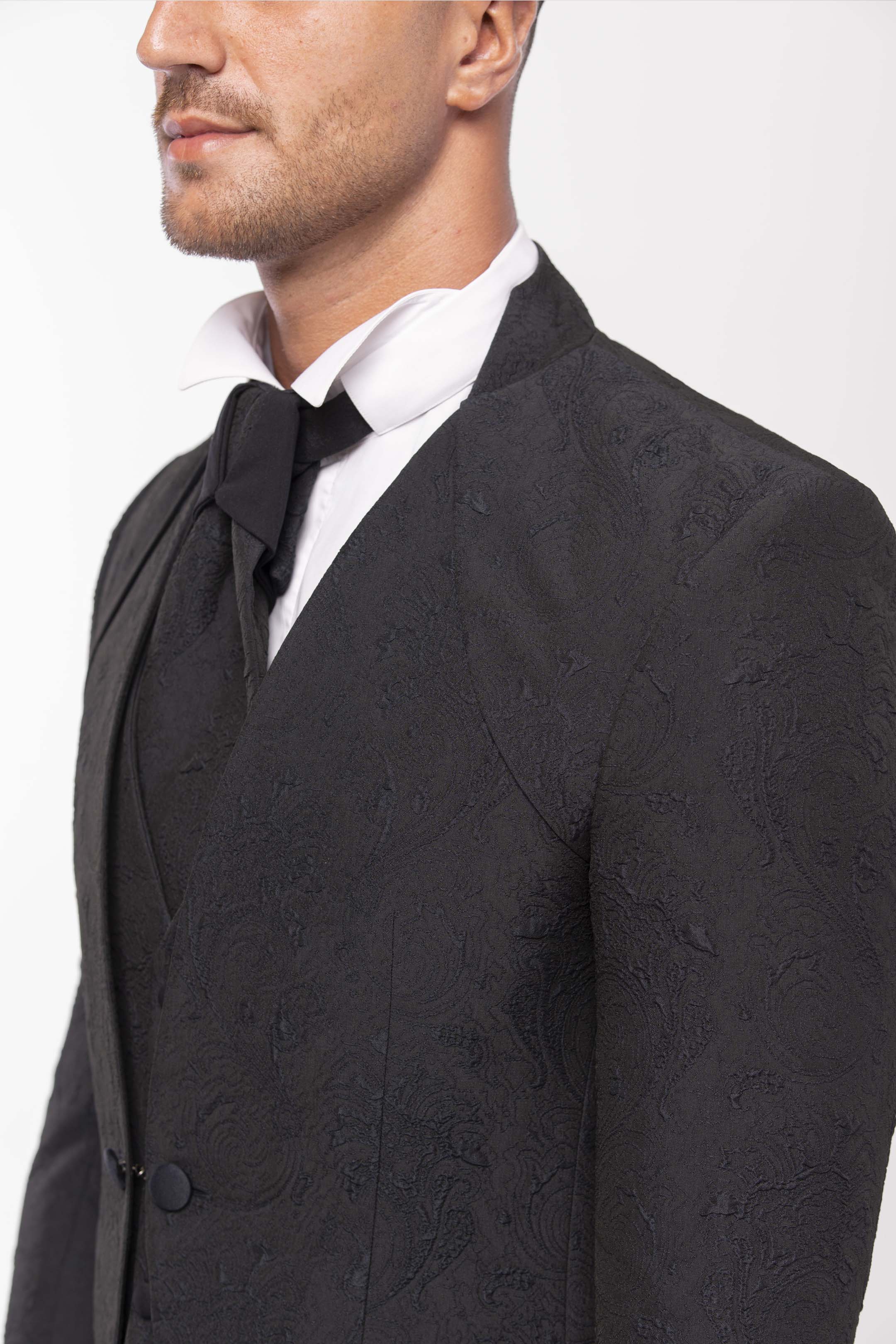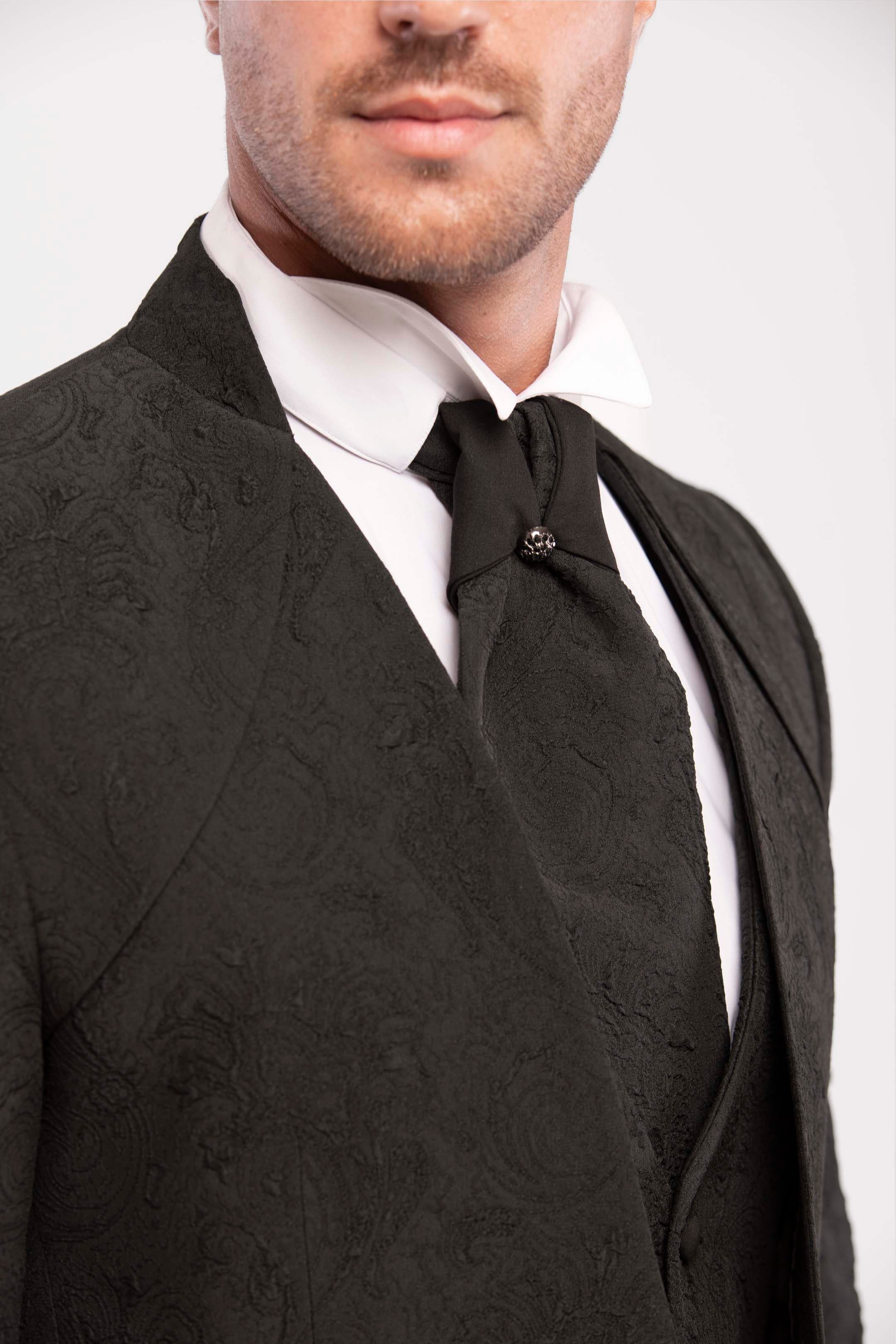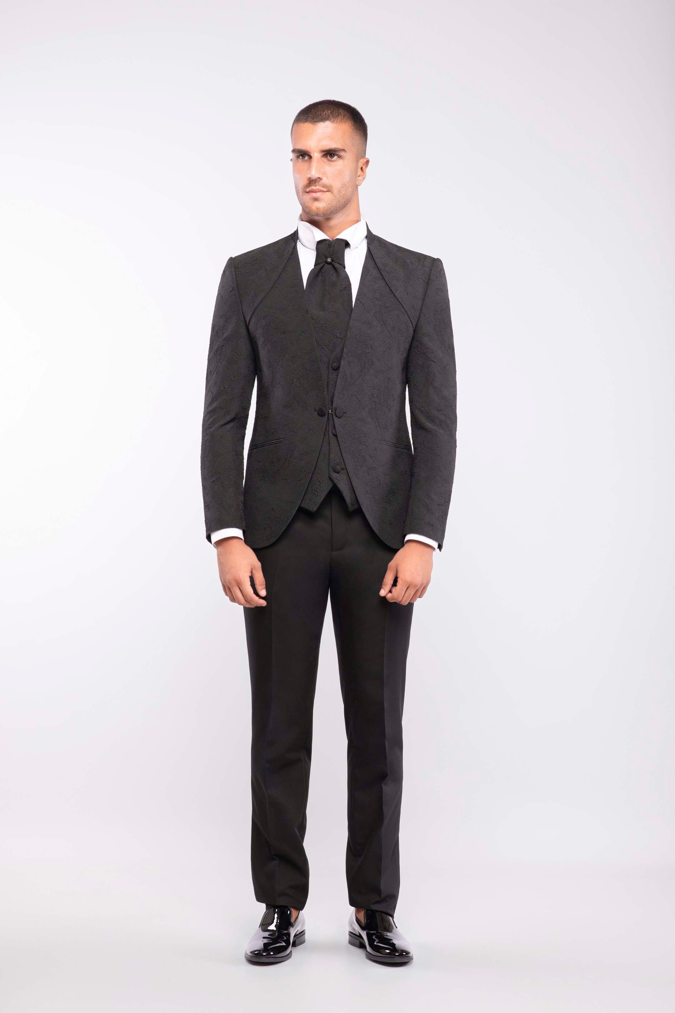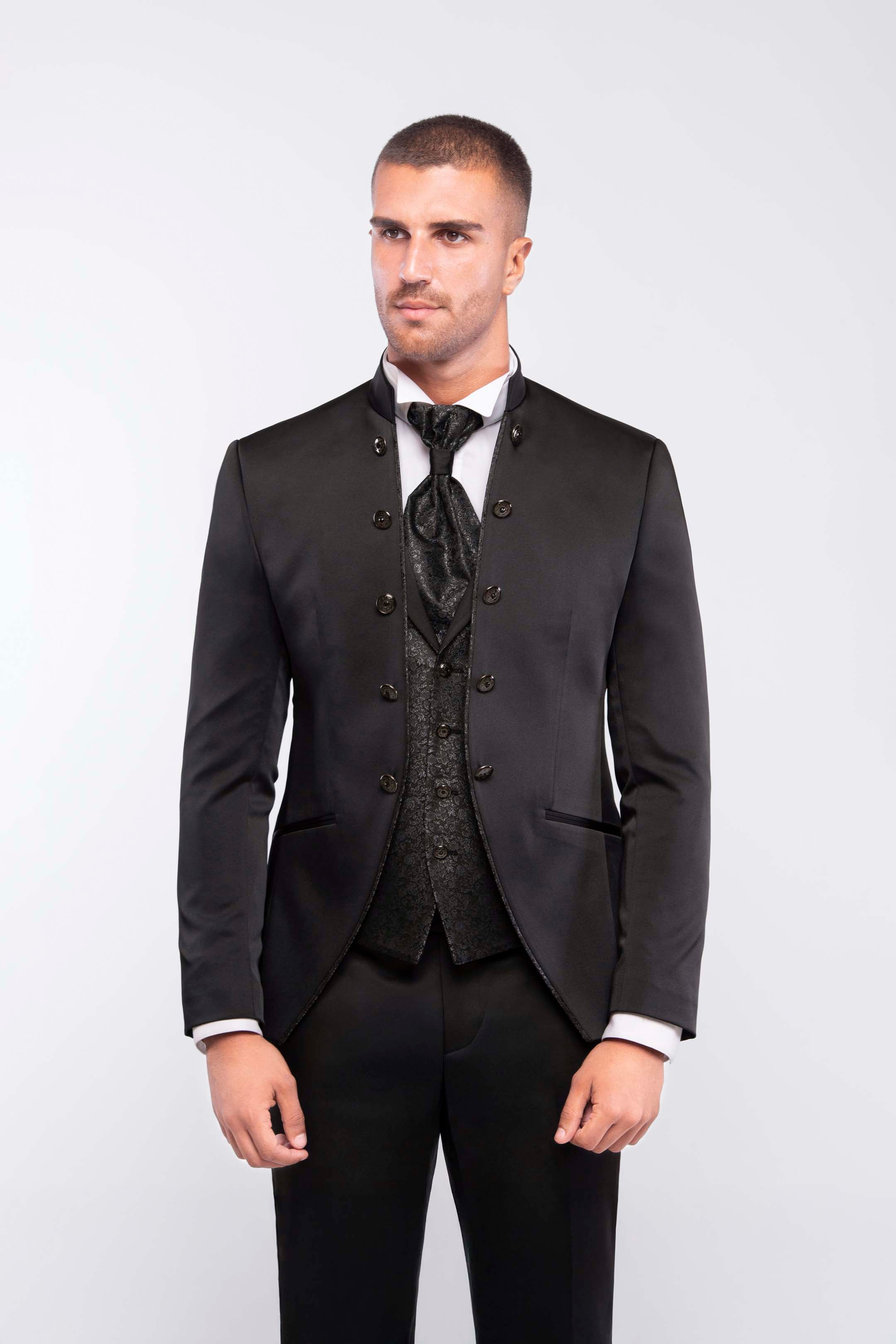 Traje de novio negro "Shard" con cuello mao y botones joya en el cuello.
