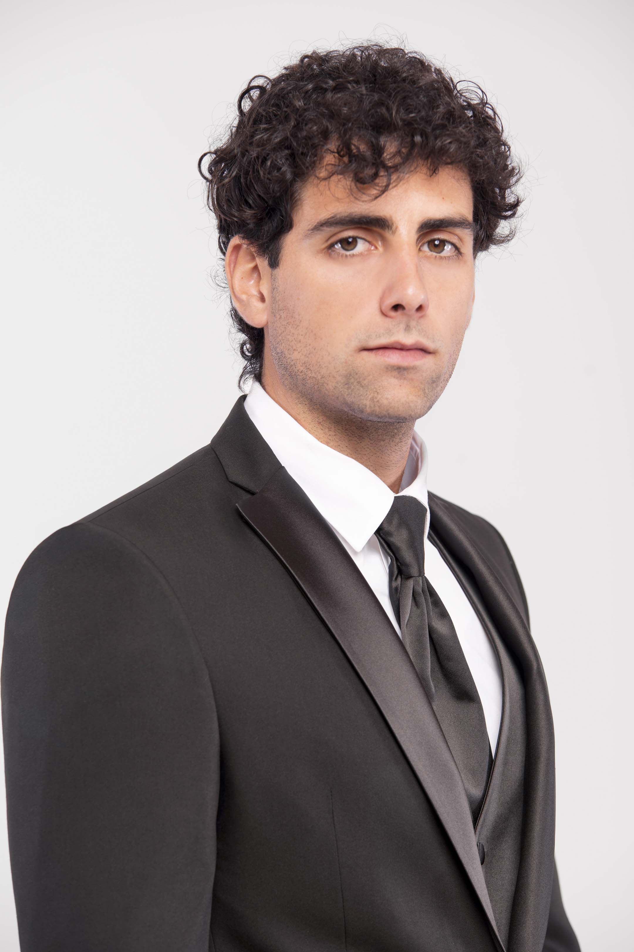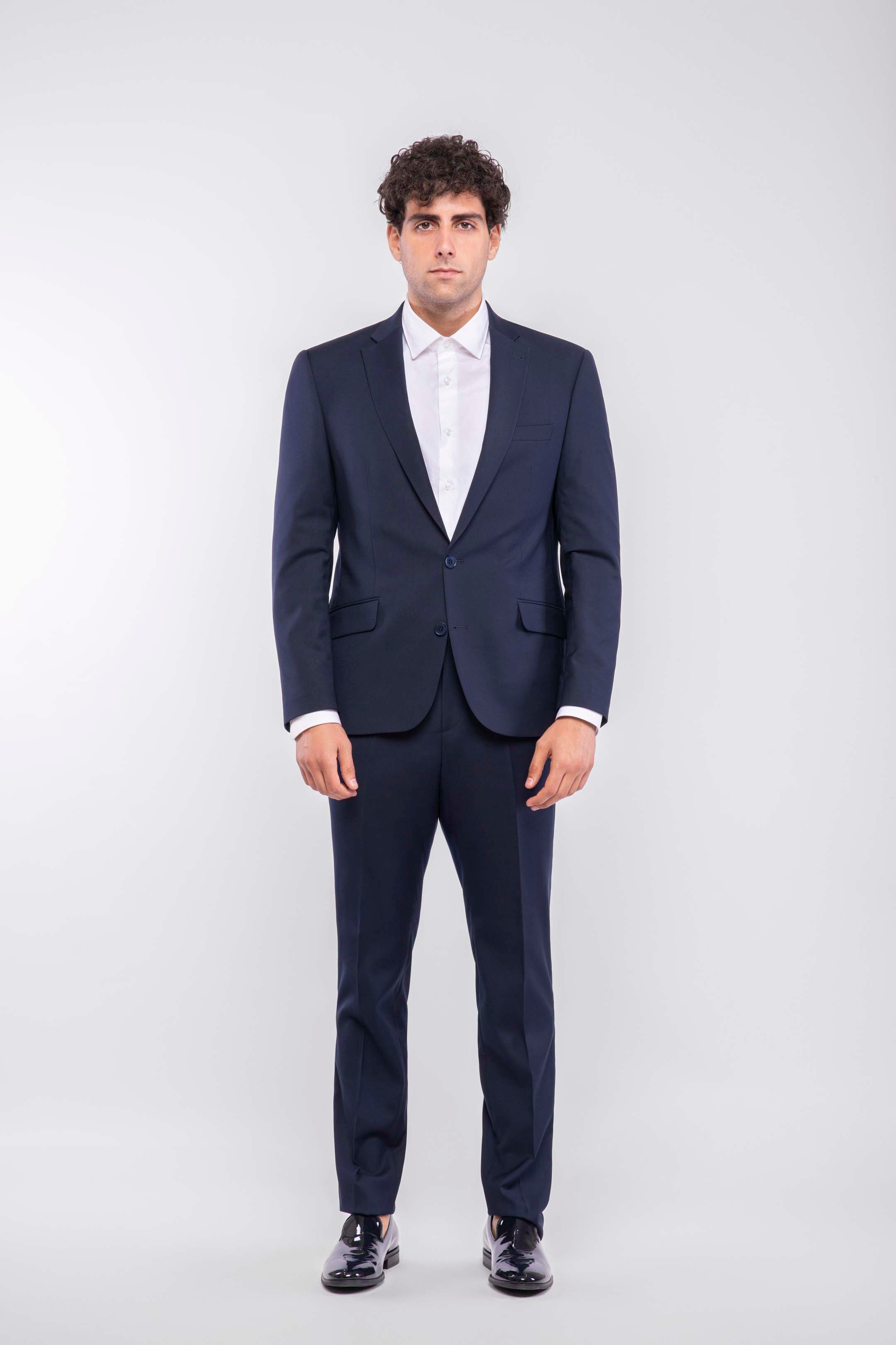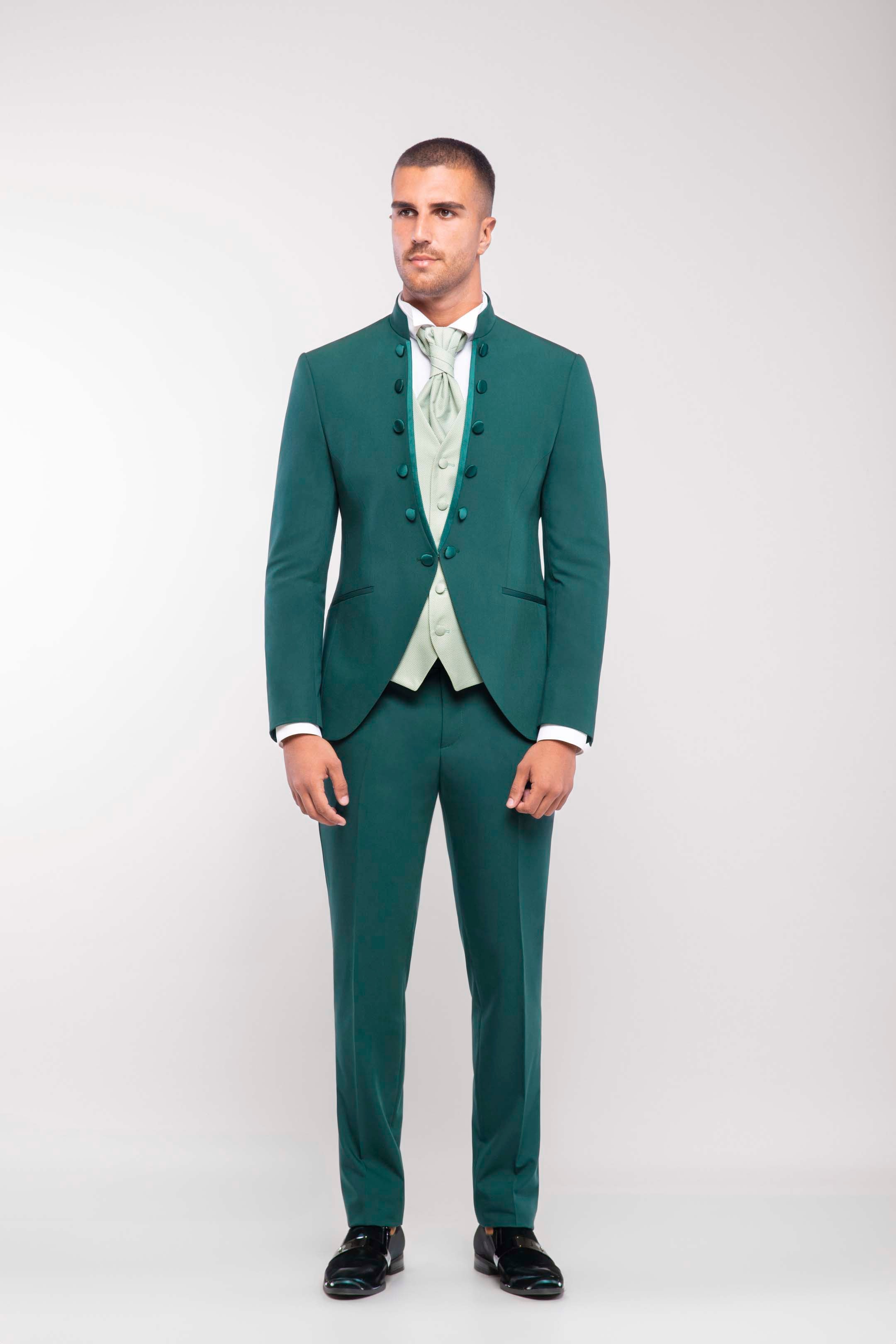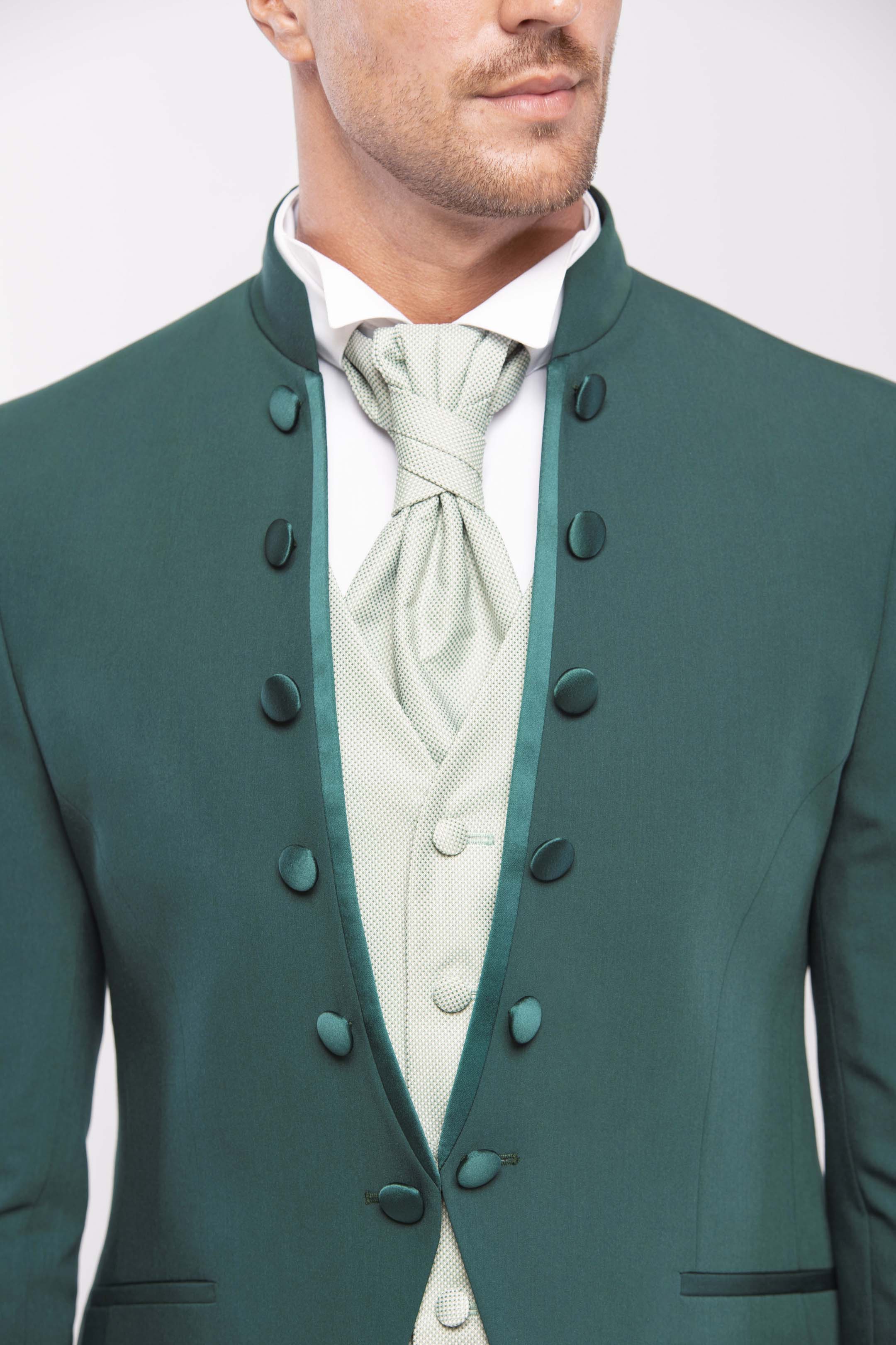 Traje de novio de cuello mandarín "Luxor" con detalles de satén en el cuello.