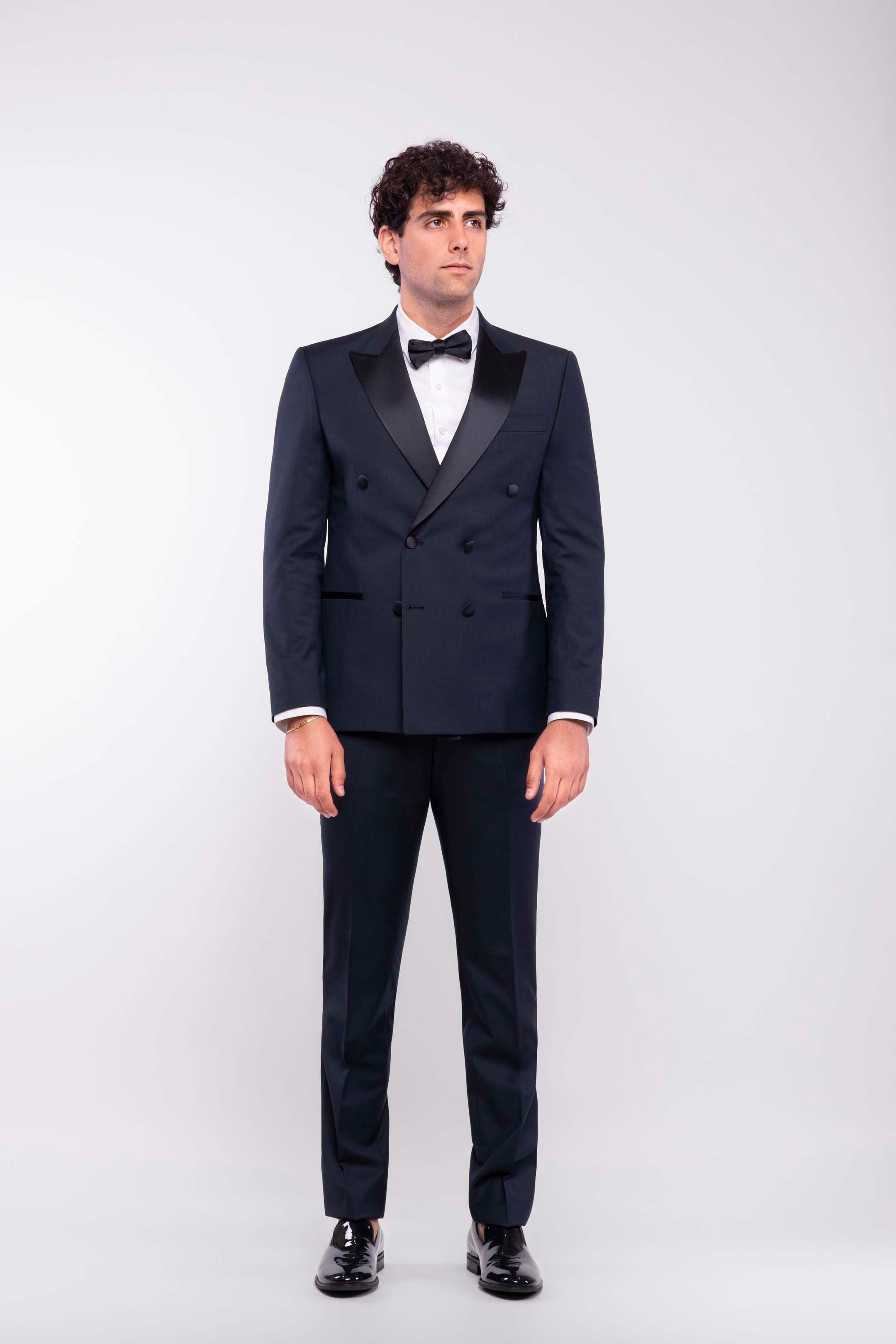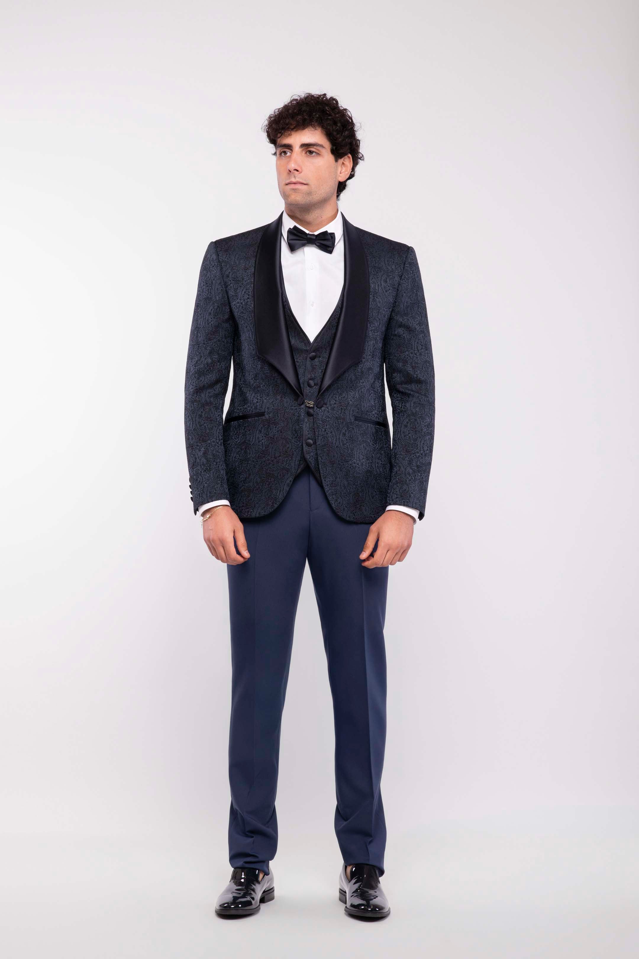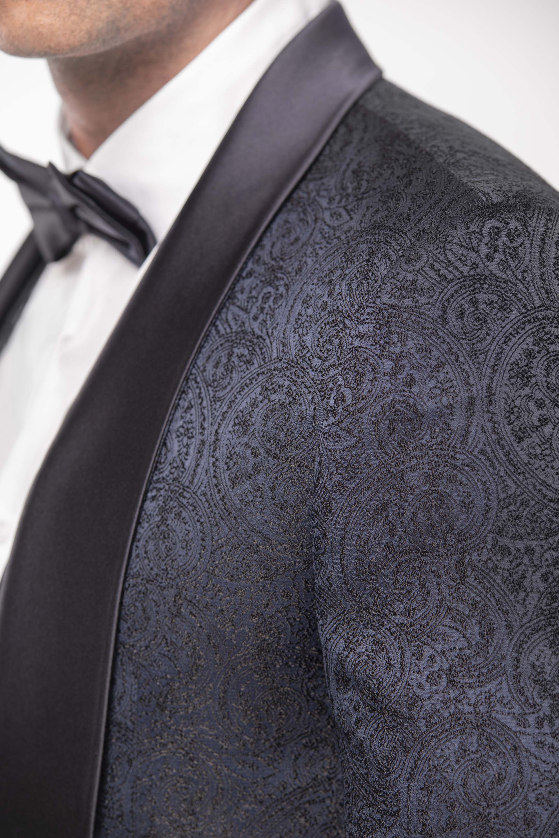 Esmoquin "Hound" en tejido pata de gallo con detalles de satén azul.