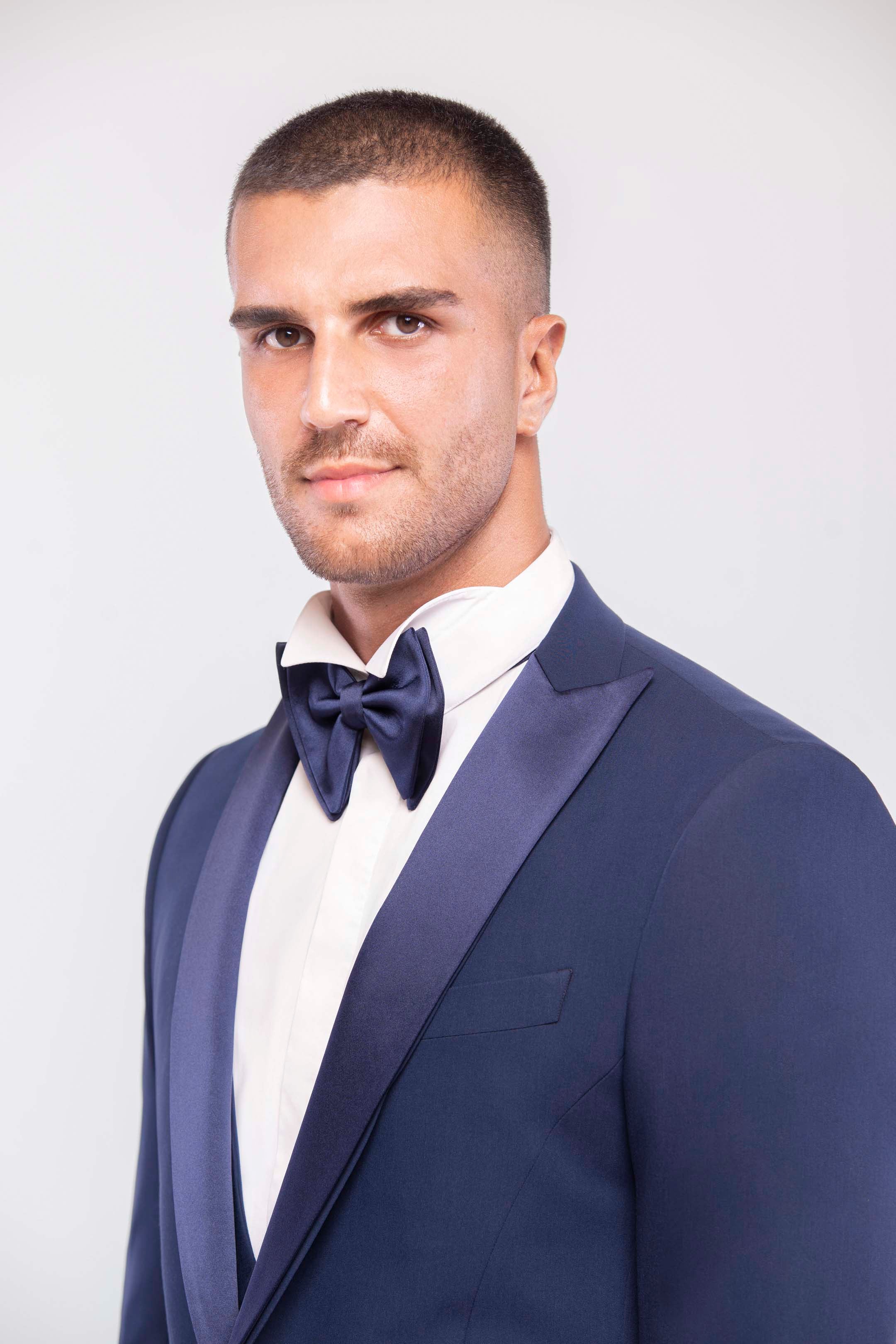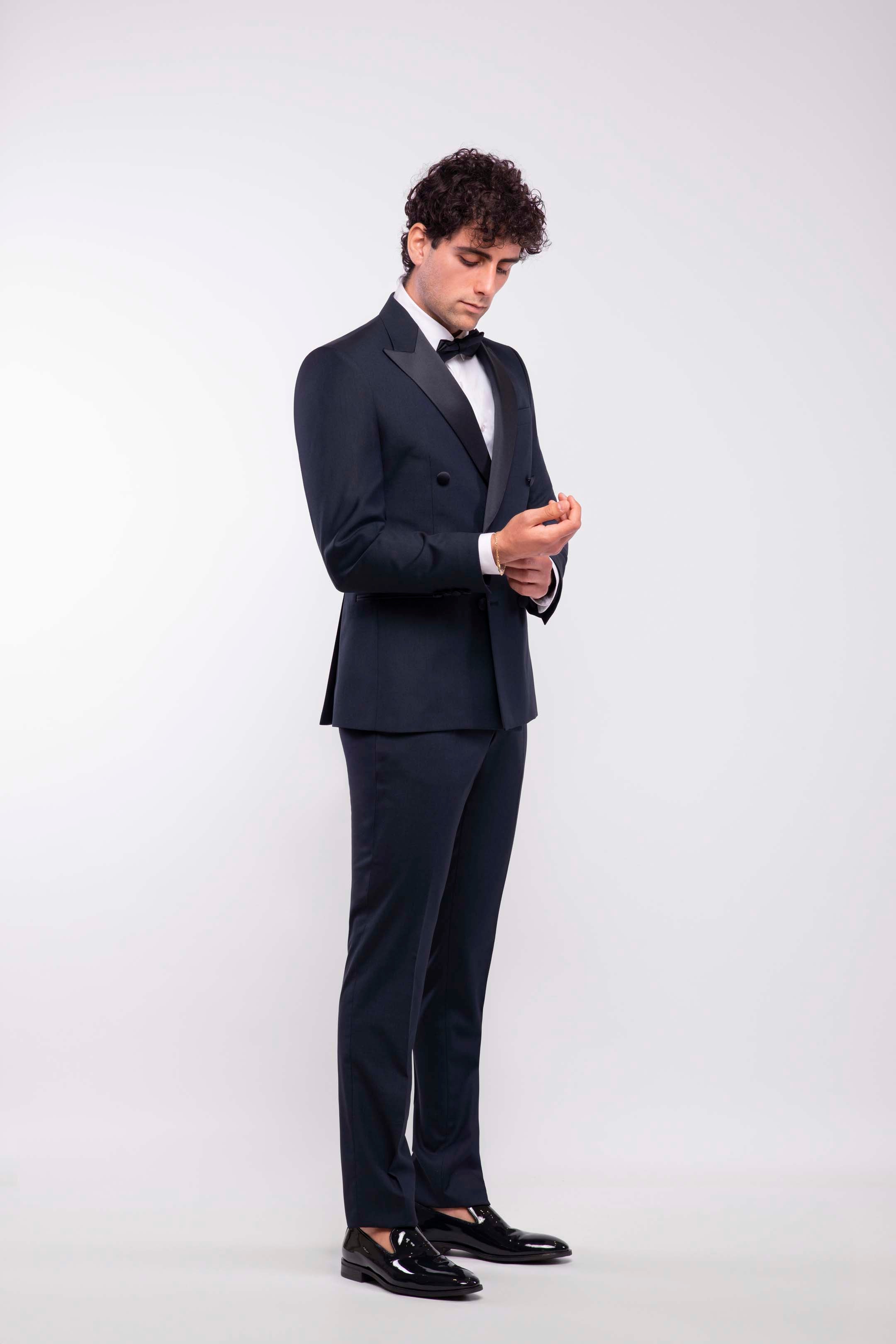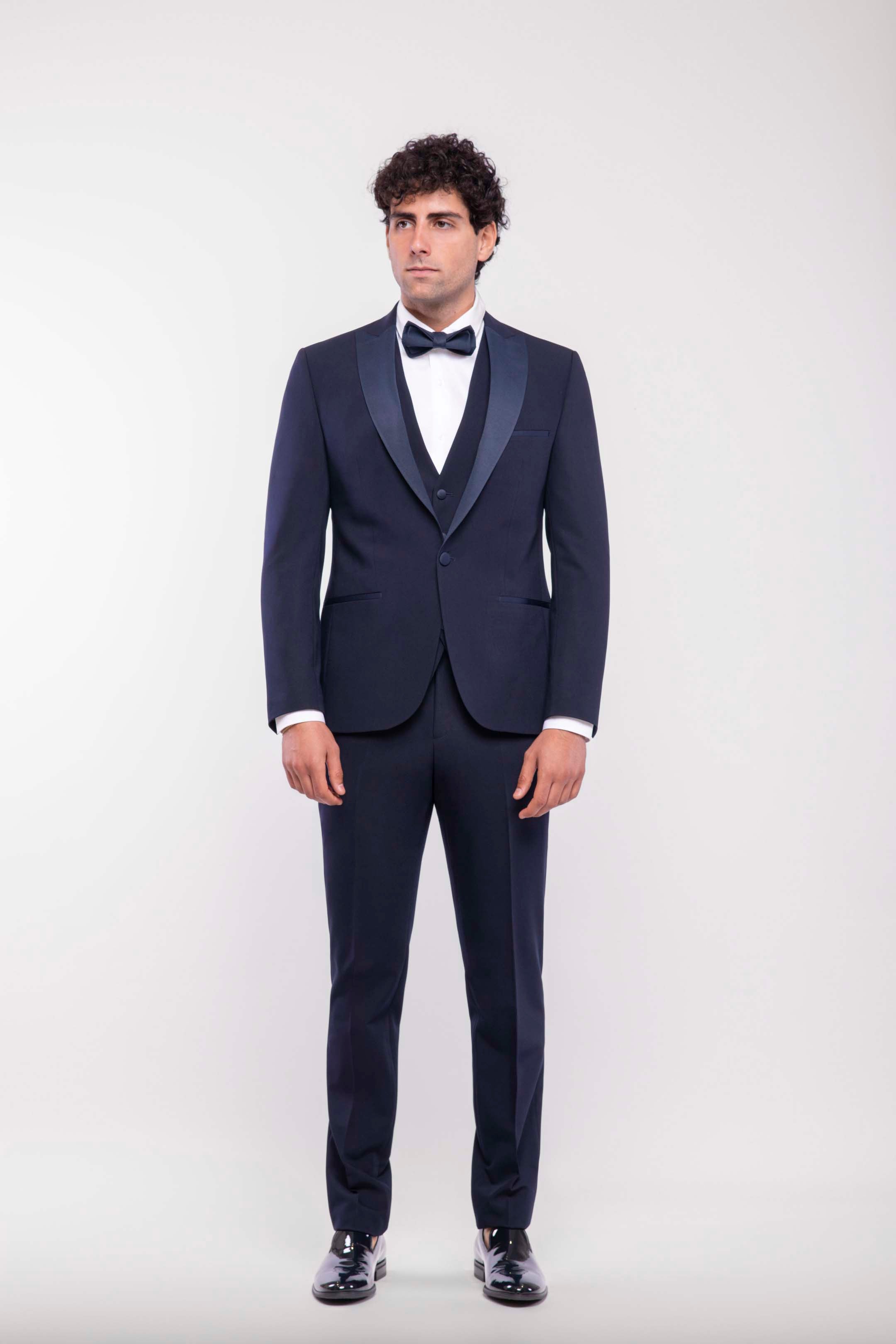 Esmoquin "Hound" en tejido pata de gallo con detalles de satén azul.