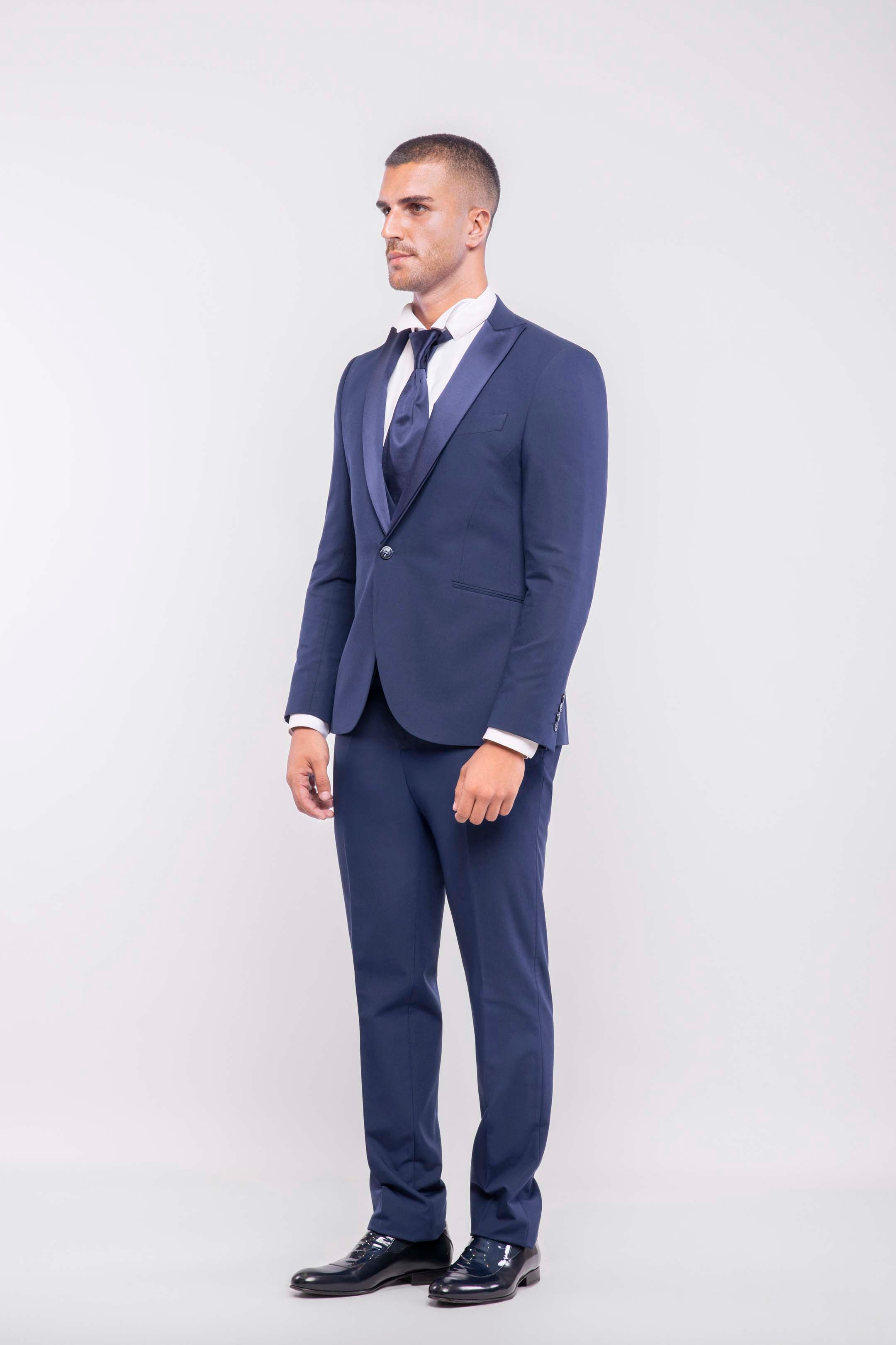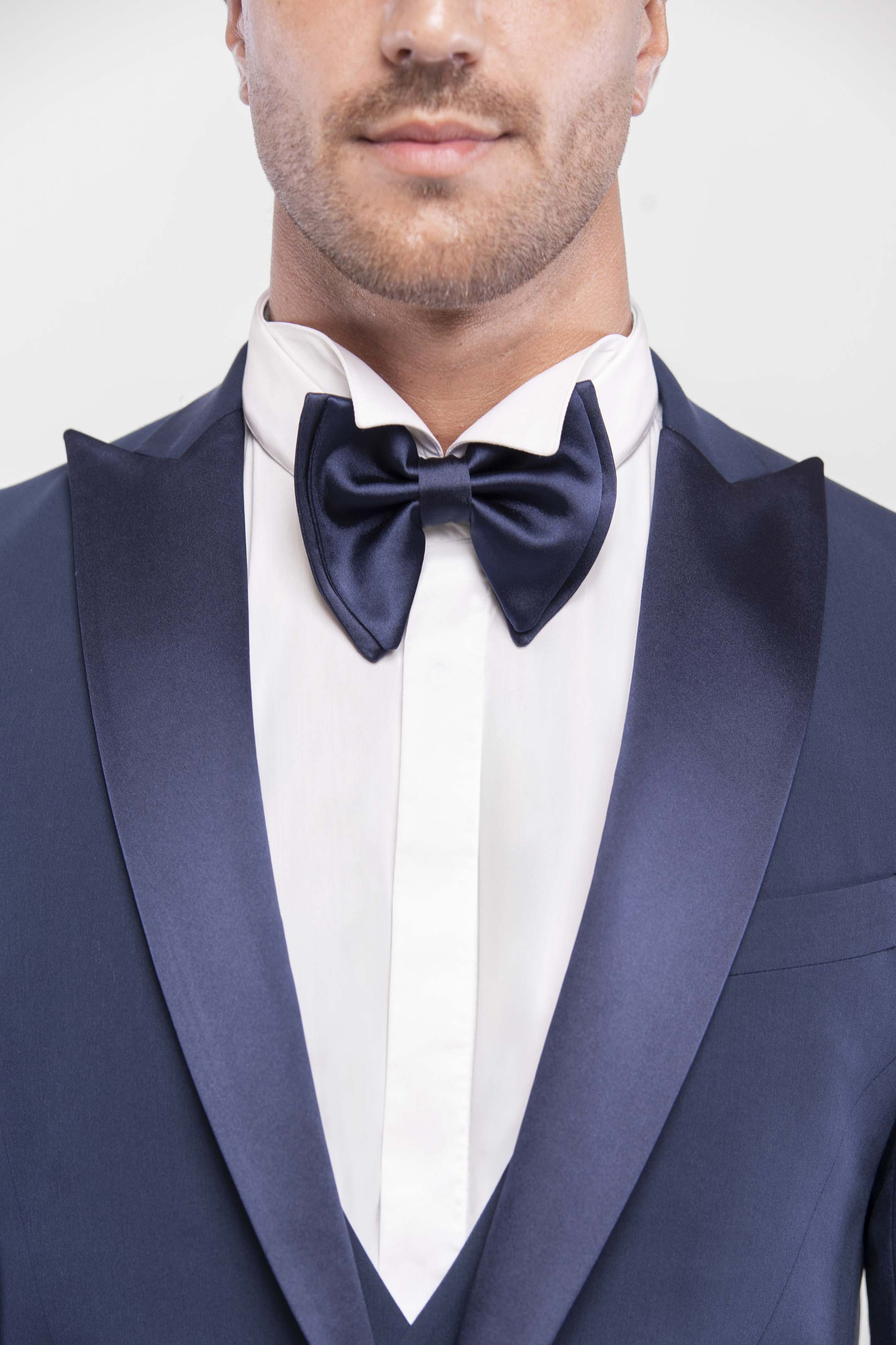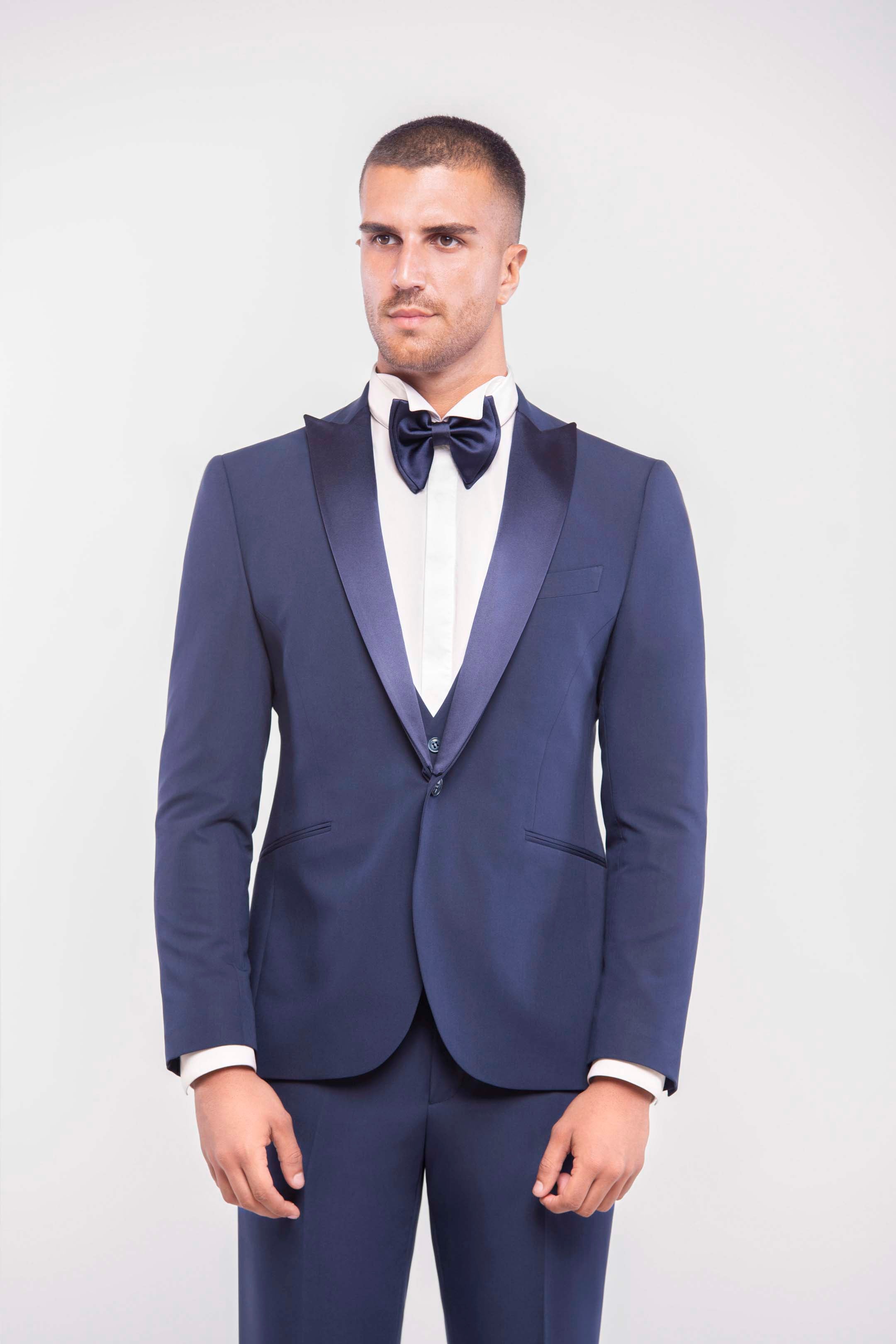 Esmoquin azul royal slim fit con solapa de pico y solapas en raso desmontables. Extremadamente versátil: perfecto para la noche con solapas en raso, y apto para el día retirando el doble cuello. Chaleco de tres botones y pajarita a tono con las solapas completan el look. Pantalones slim fit con bolsillo ribeteado, para quienes desean destacar con absoluta elegancia.