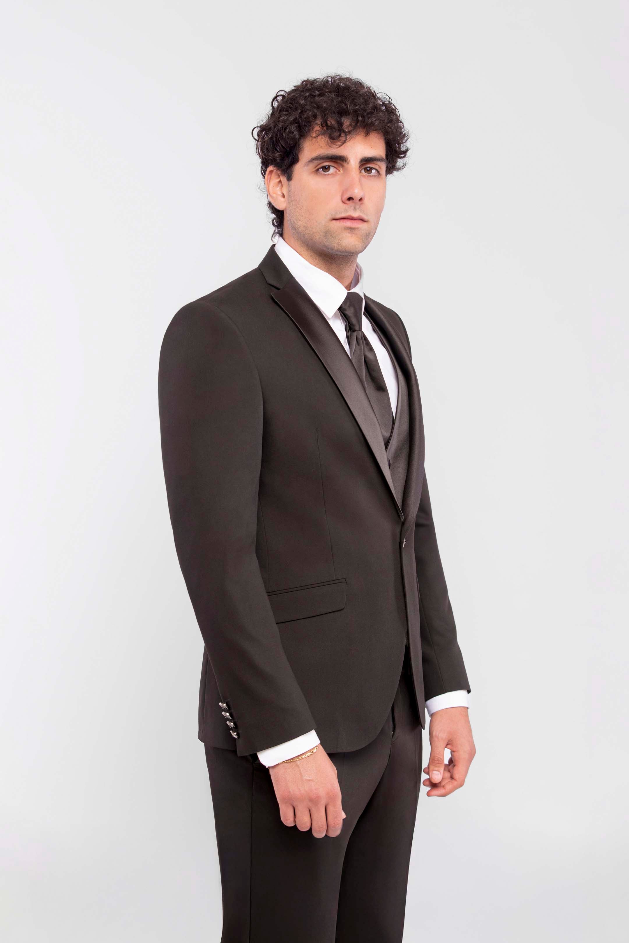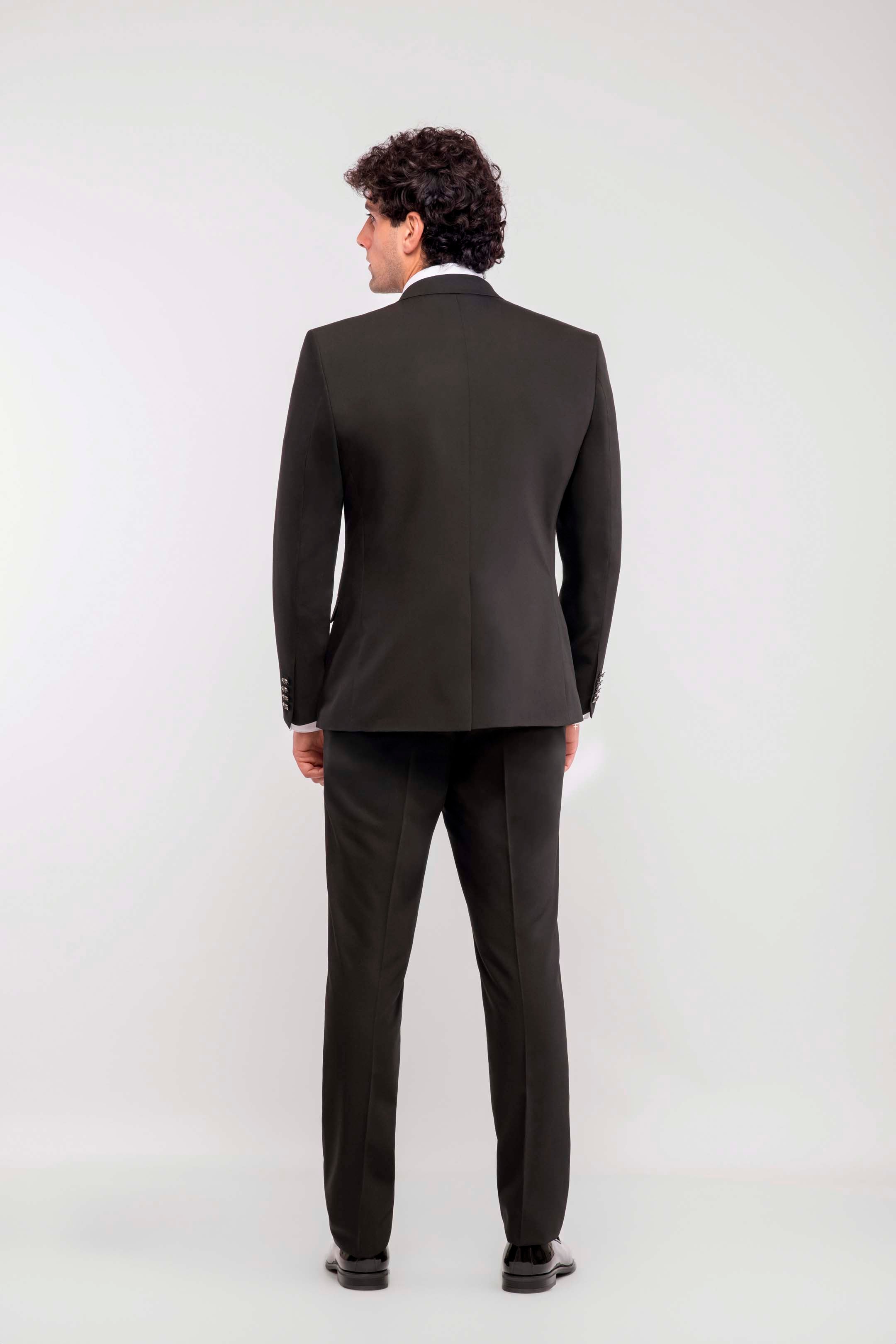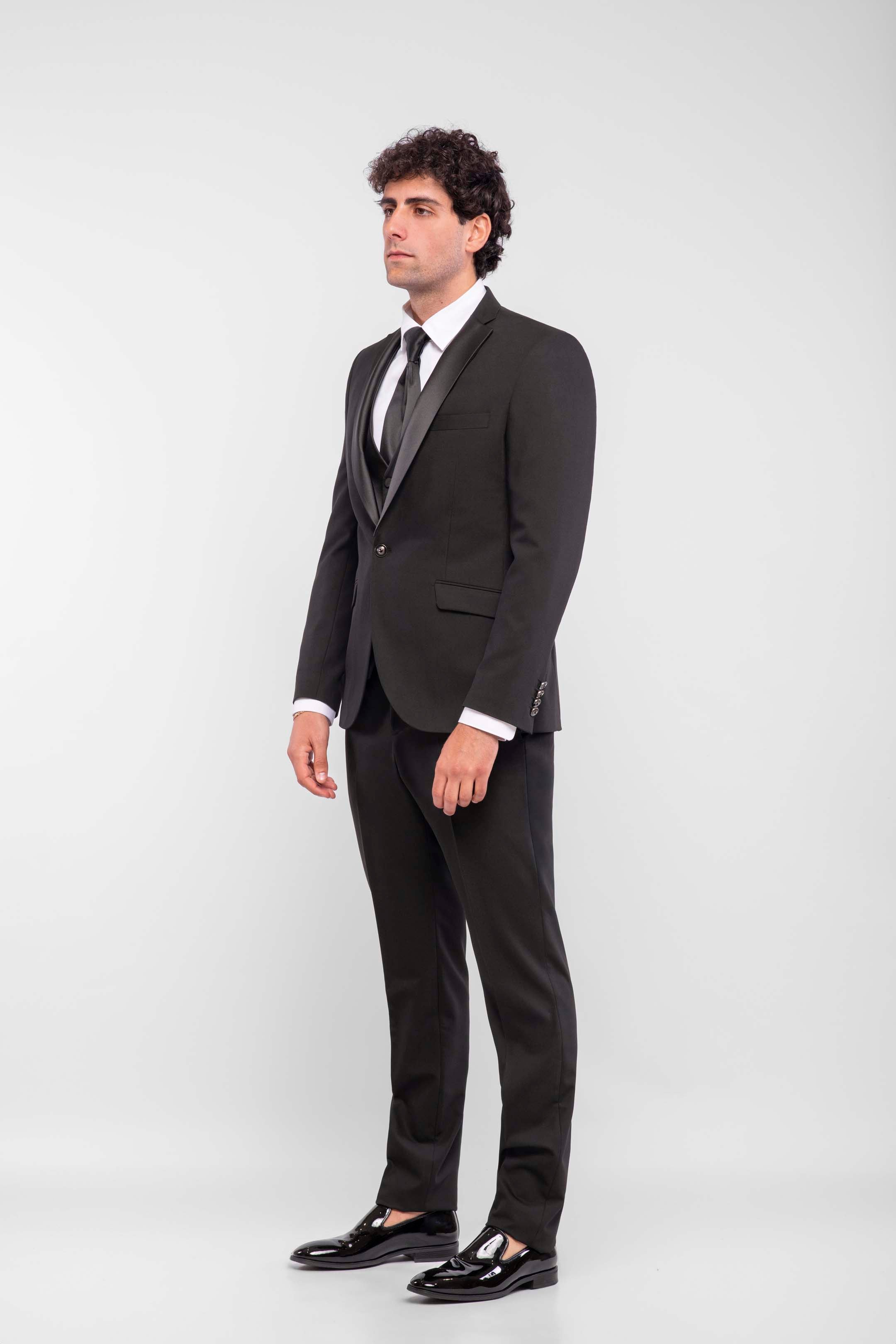 Esmoquin negro total con solapa de pico y solapas en raso. Chaqueta de un botón, bolsillos con solapa a la vista y chaleco al tono con cuatro botones forrados en tejido. El look se completa con un plastrón a juego, para un estilo sobrio e impecable, ideal para una velada a la luz de las velas.