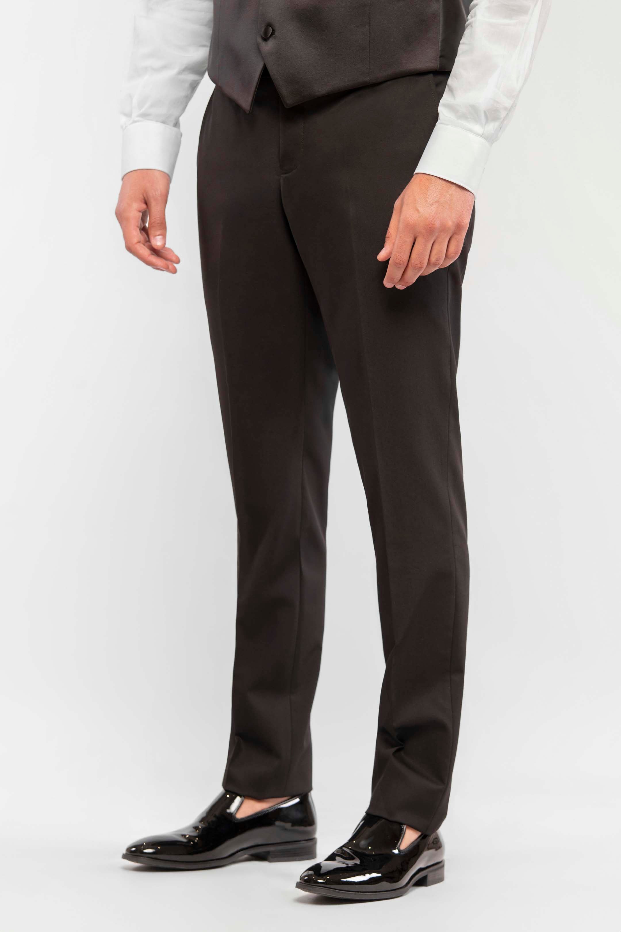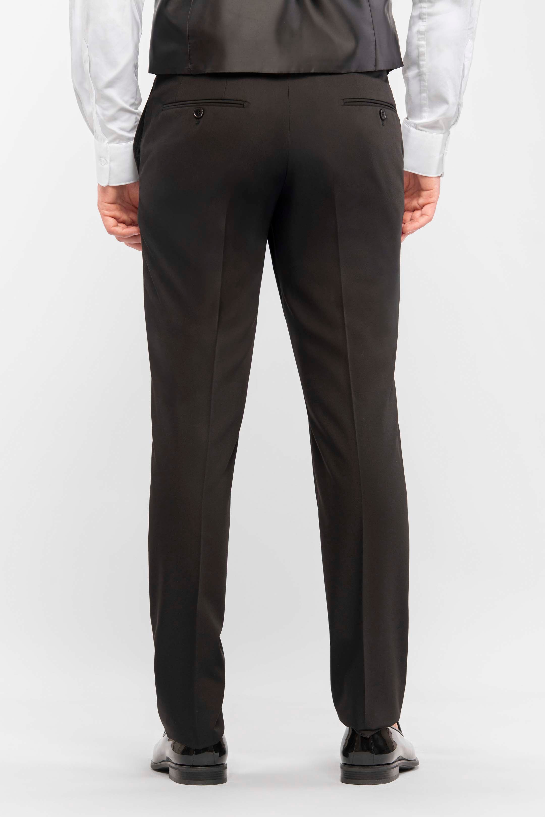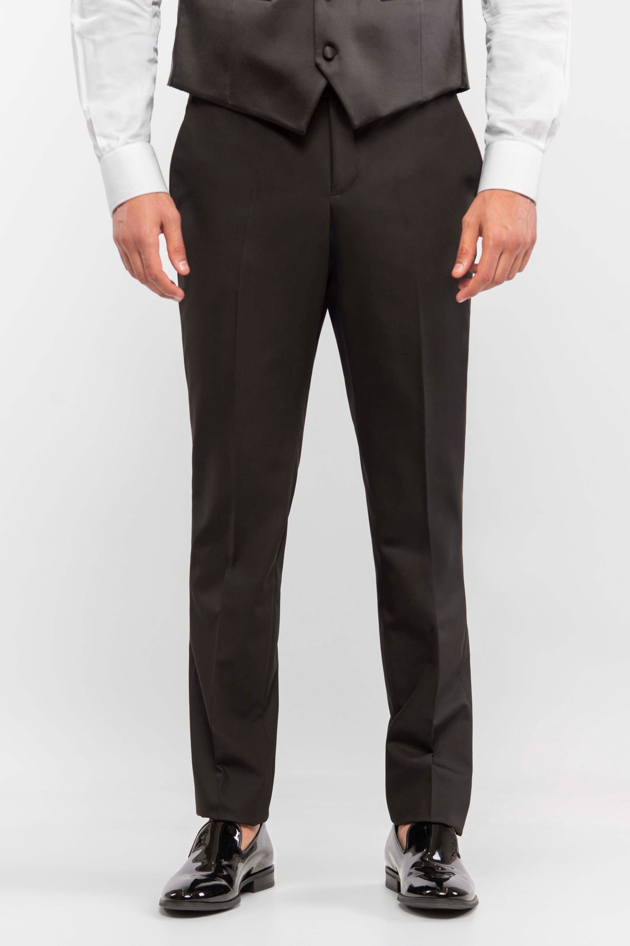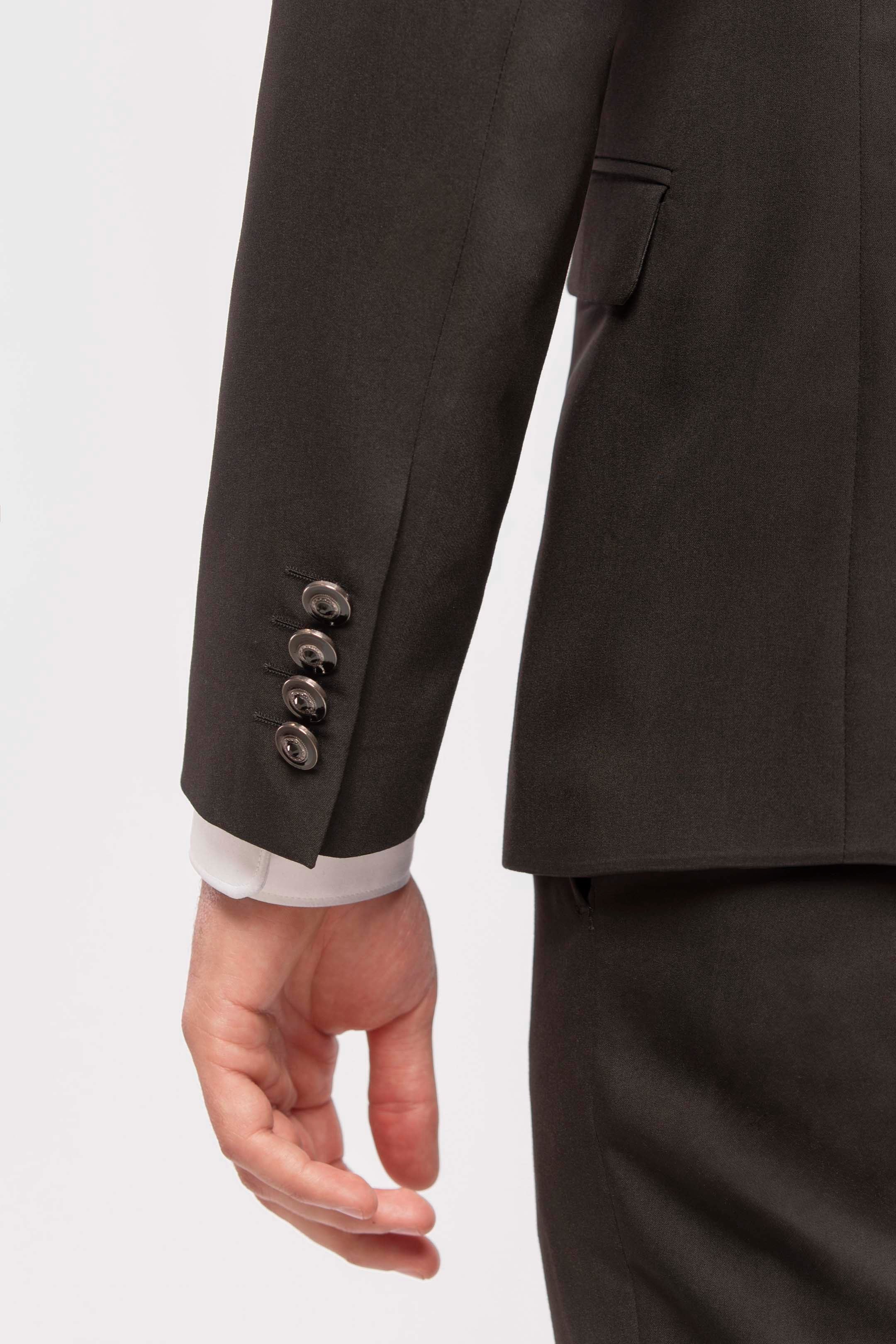 Esmoquin negro total con solapa de pico y solapas en raso. Chaqueta de un botón, bolsillos con solapa a la vista y chaleco al tono con cuatro botones forrados en tejido. El look se completa con un plastrón a juego, para un estilo sobrio e impecable, ideal para una velada a la luz de las velas.