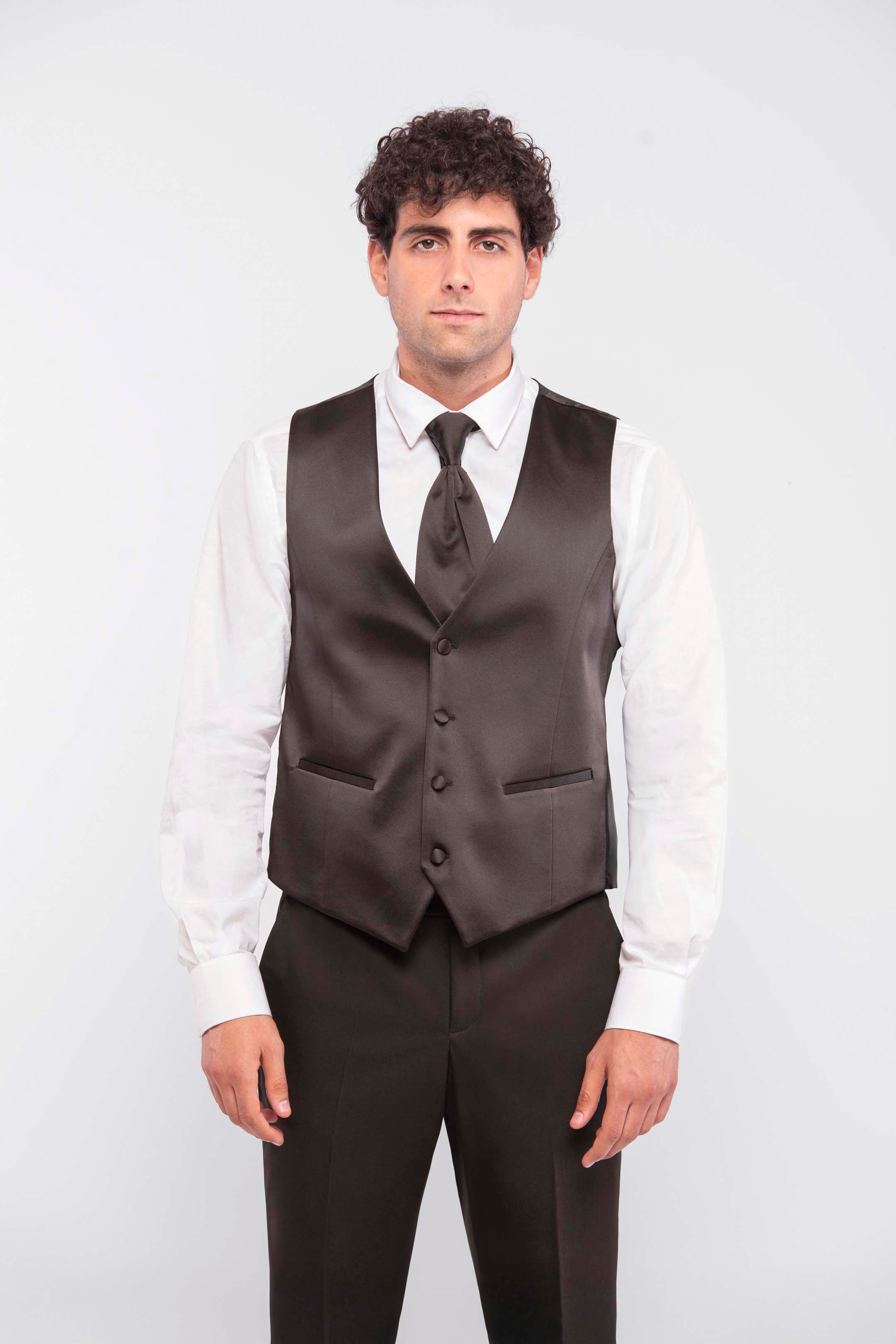 • El conjunto está compuesto por chaqueta, pantalón, chaleco y plastrón