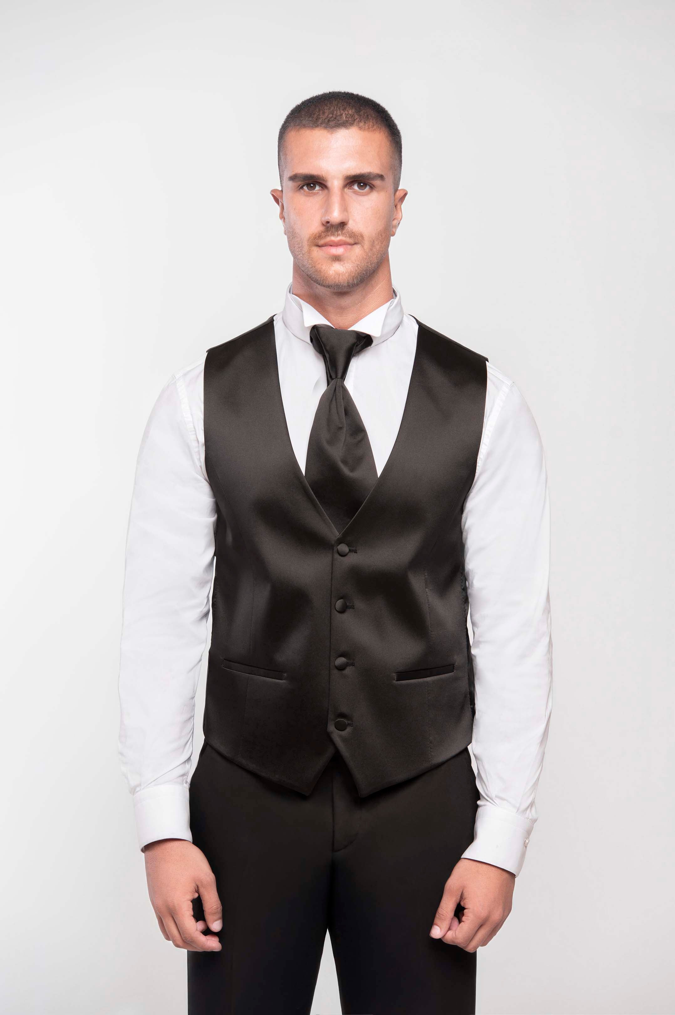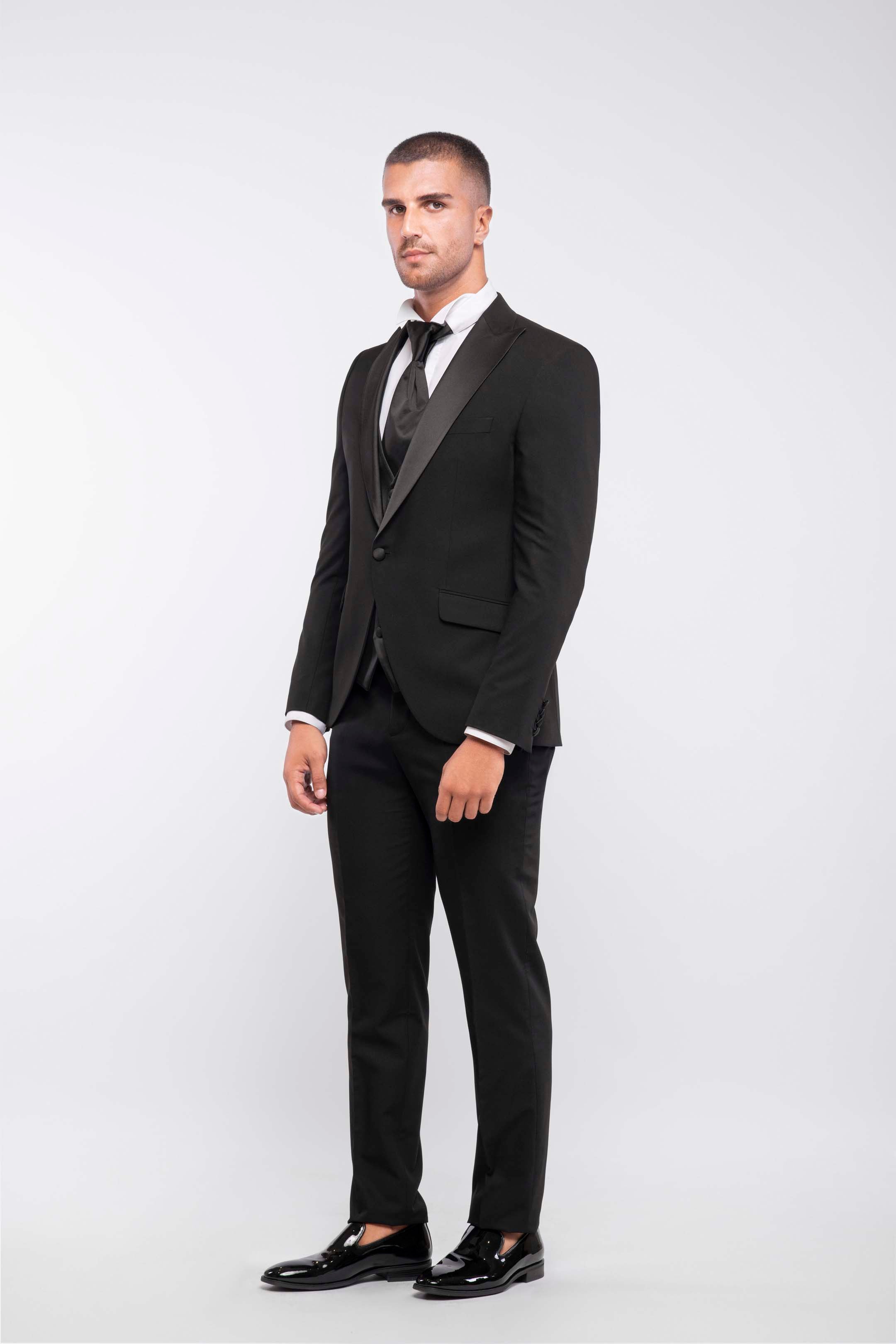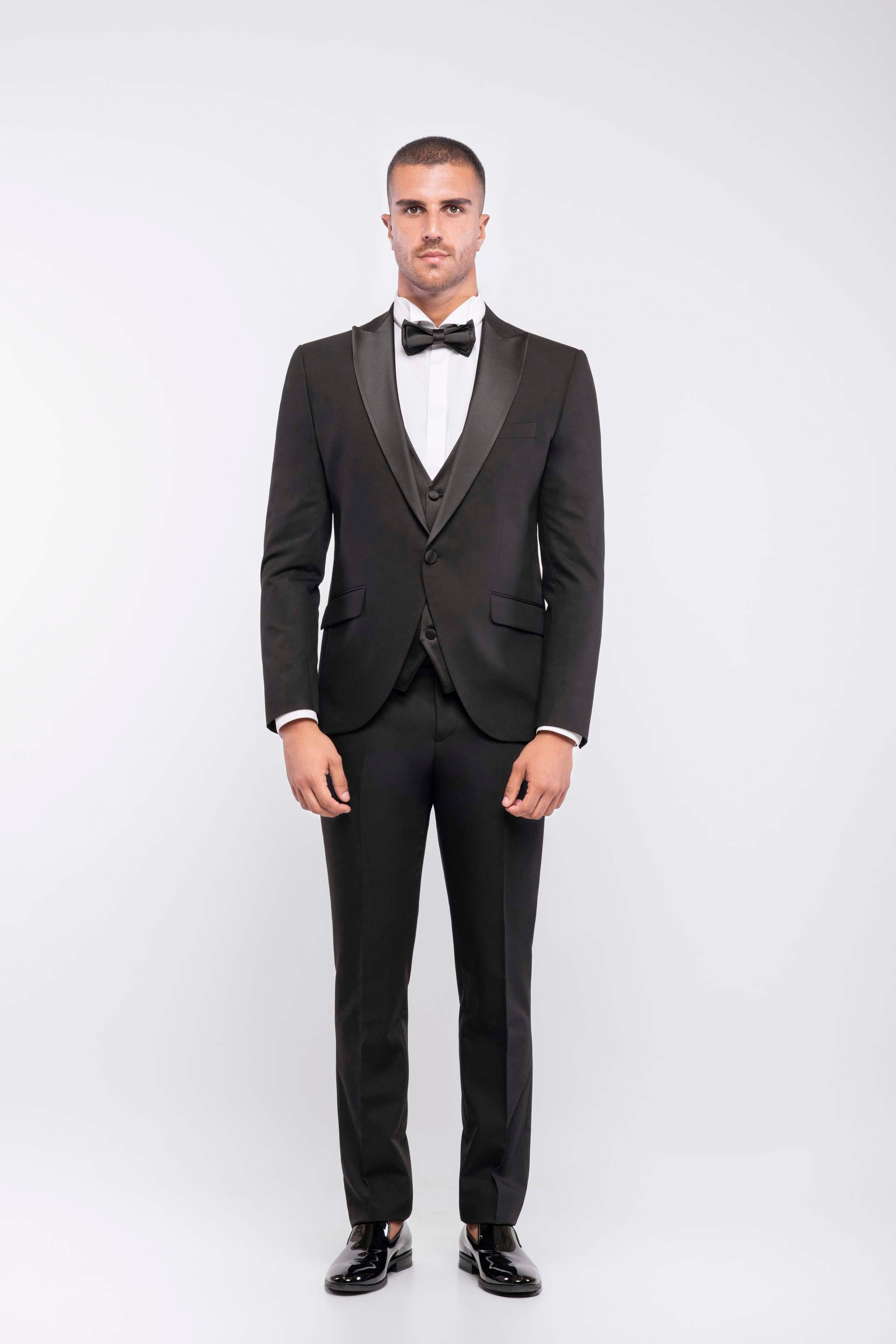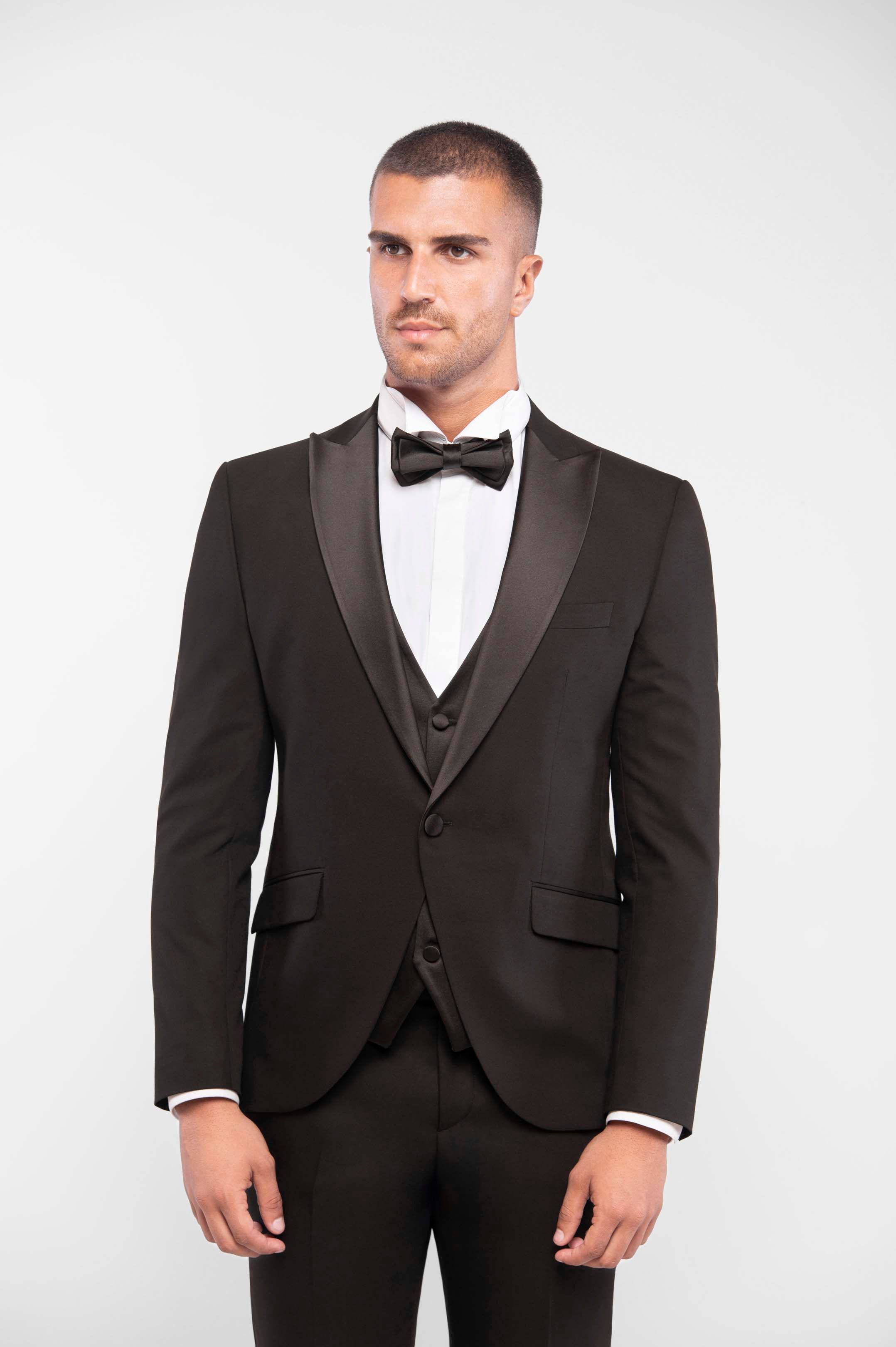 Traje formal completamente negro con cuello de lanza de 12 cm y chaqueta con cierre de un botón, chaleco coordinado con 4 botones y pajarita forrada en satén.