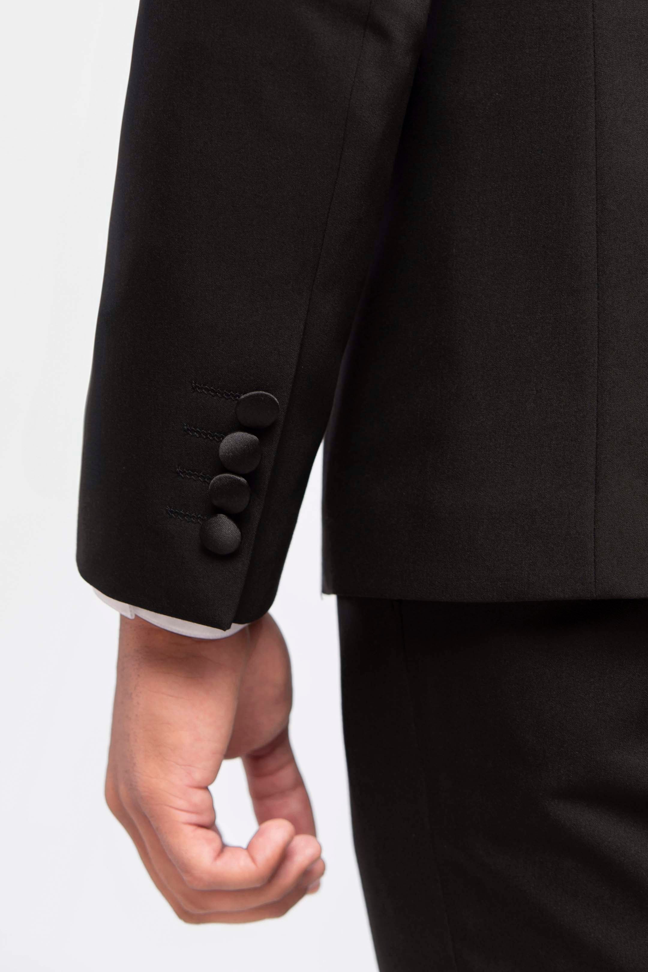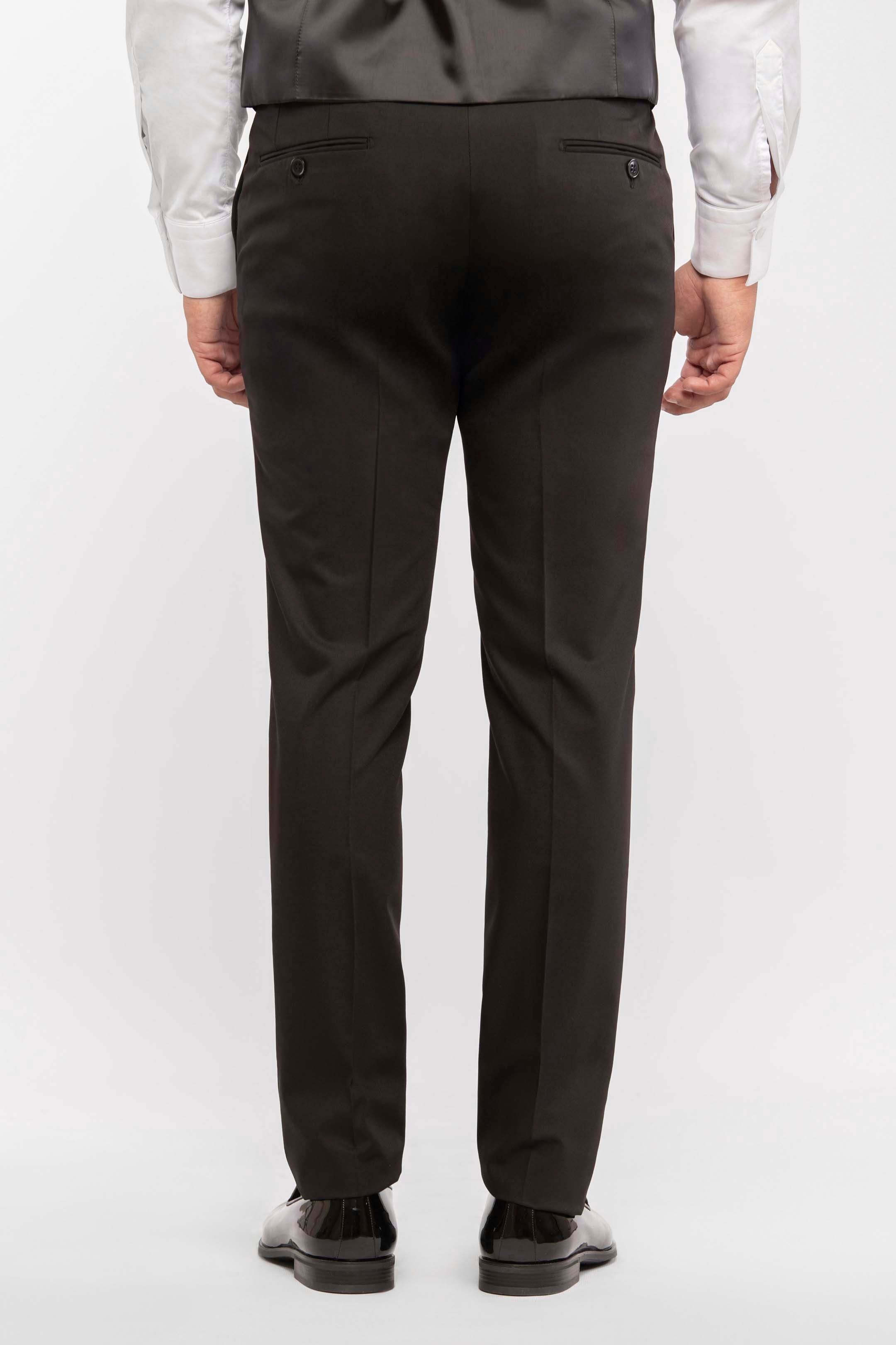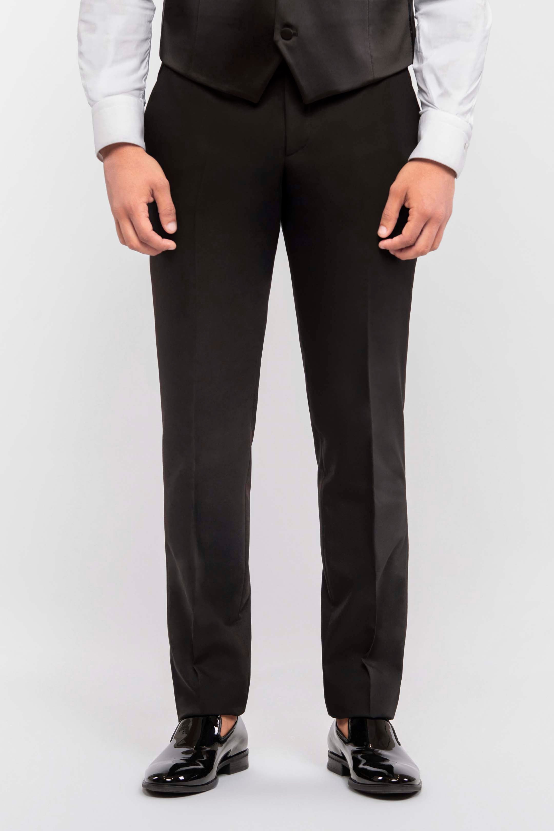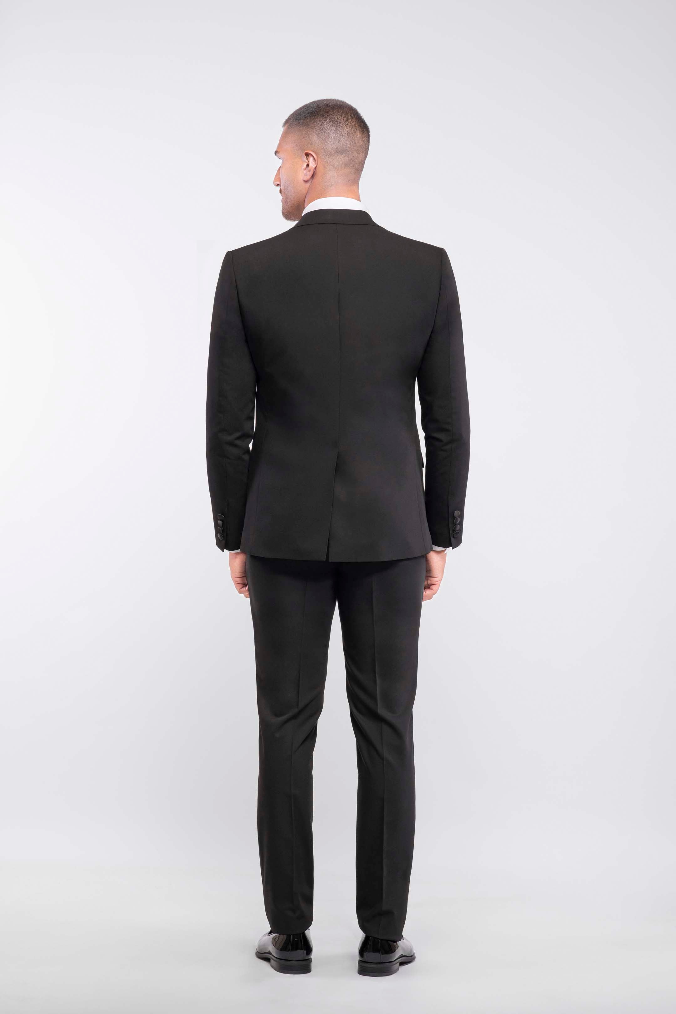 Traje formal completamente negro con cuello de lanza de 12 cm y chaqueta con cierre de un botón, chaleco coordinado con 4 botones y pajarita forrada en satén.
